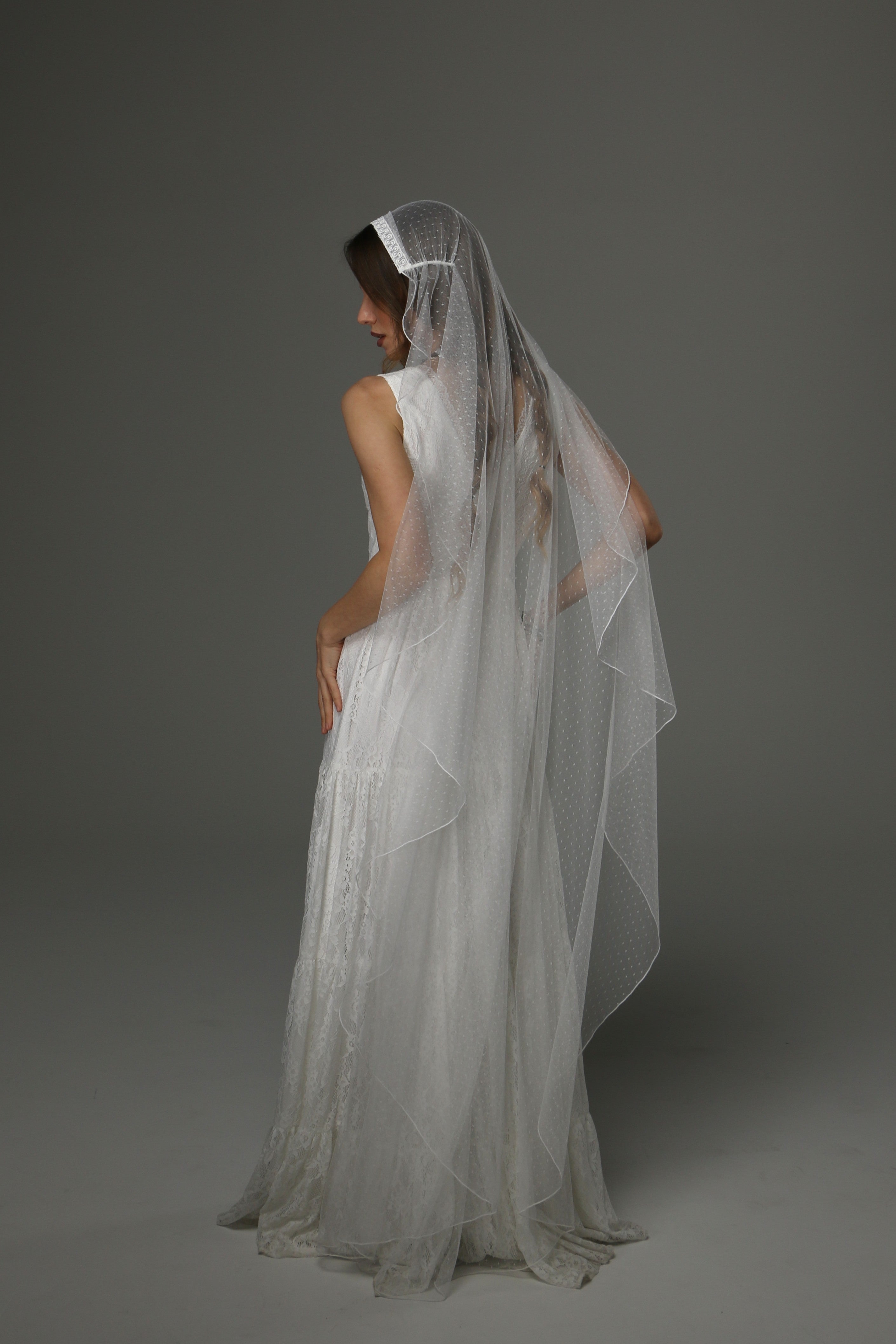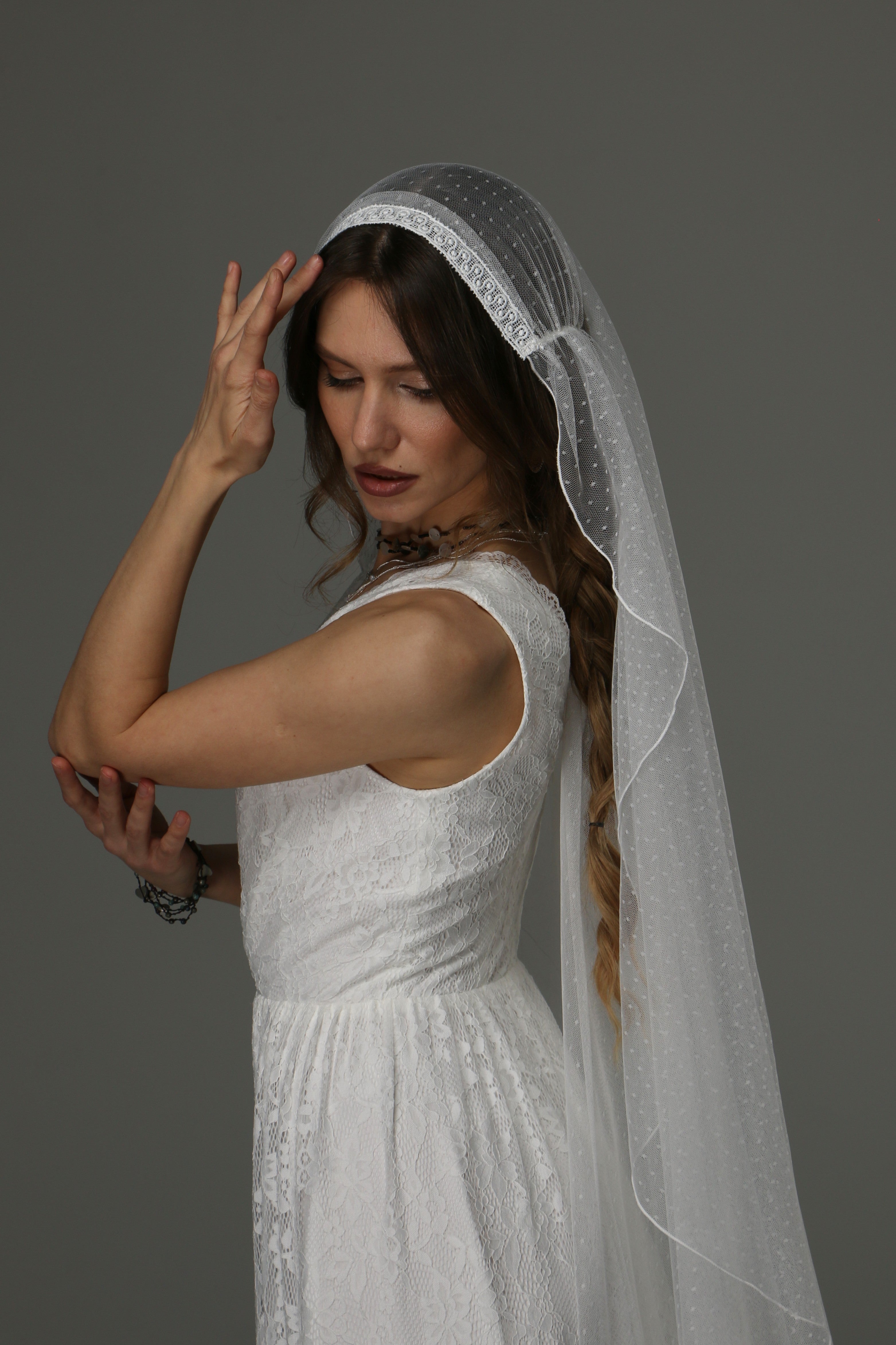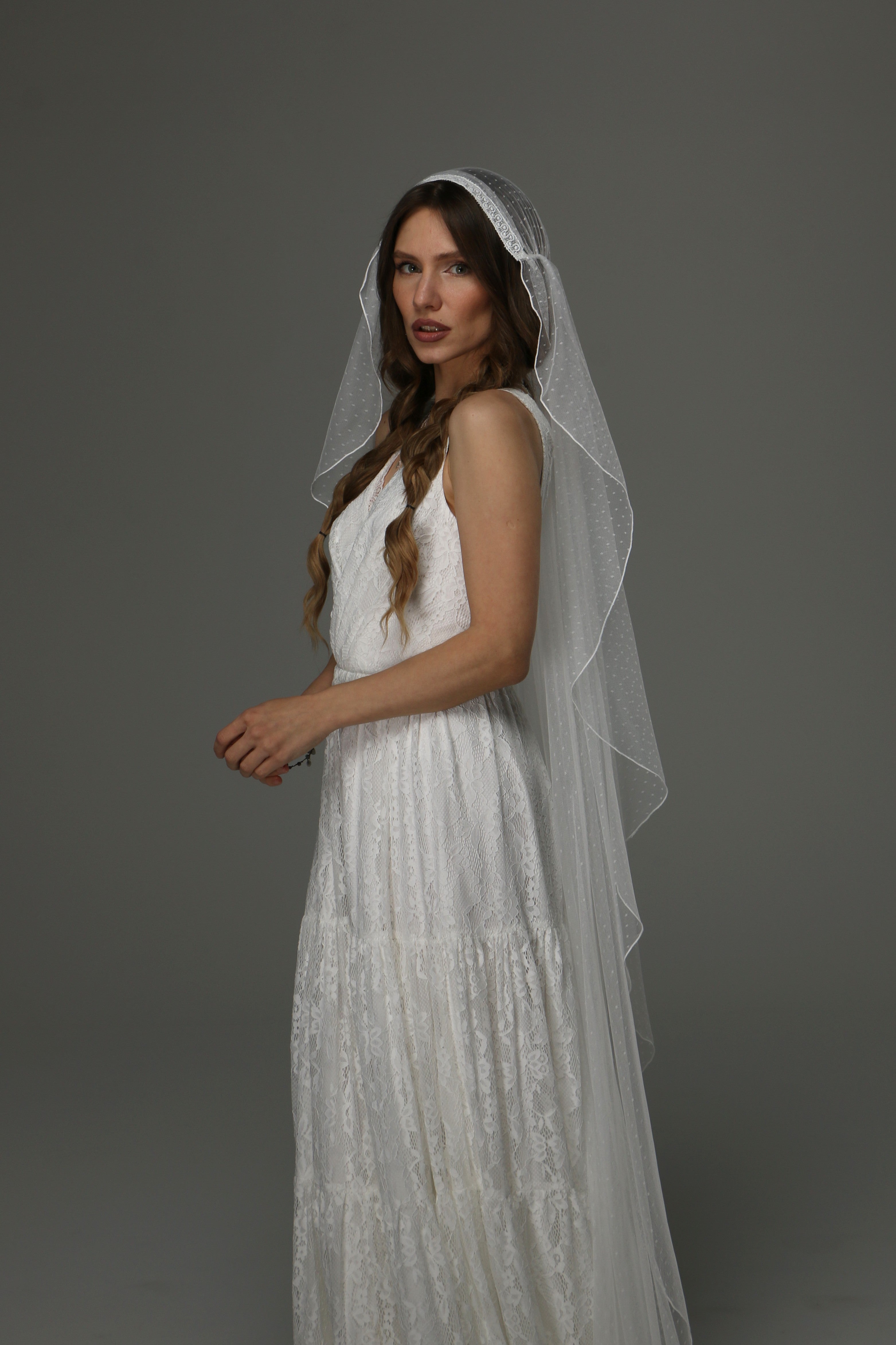 Boho Juliet Cap Wedding Veil with Lace, Dotted Tulle Bridal Veil with Pencil Edge, Vintage Bohemian Veil