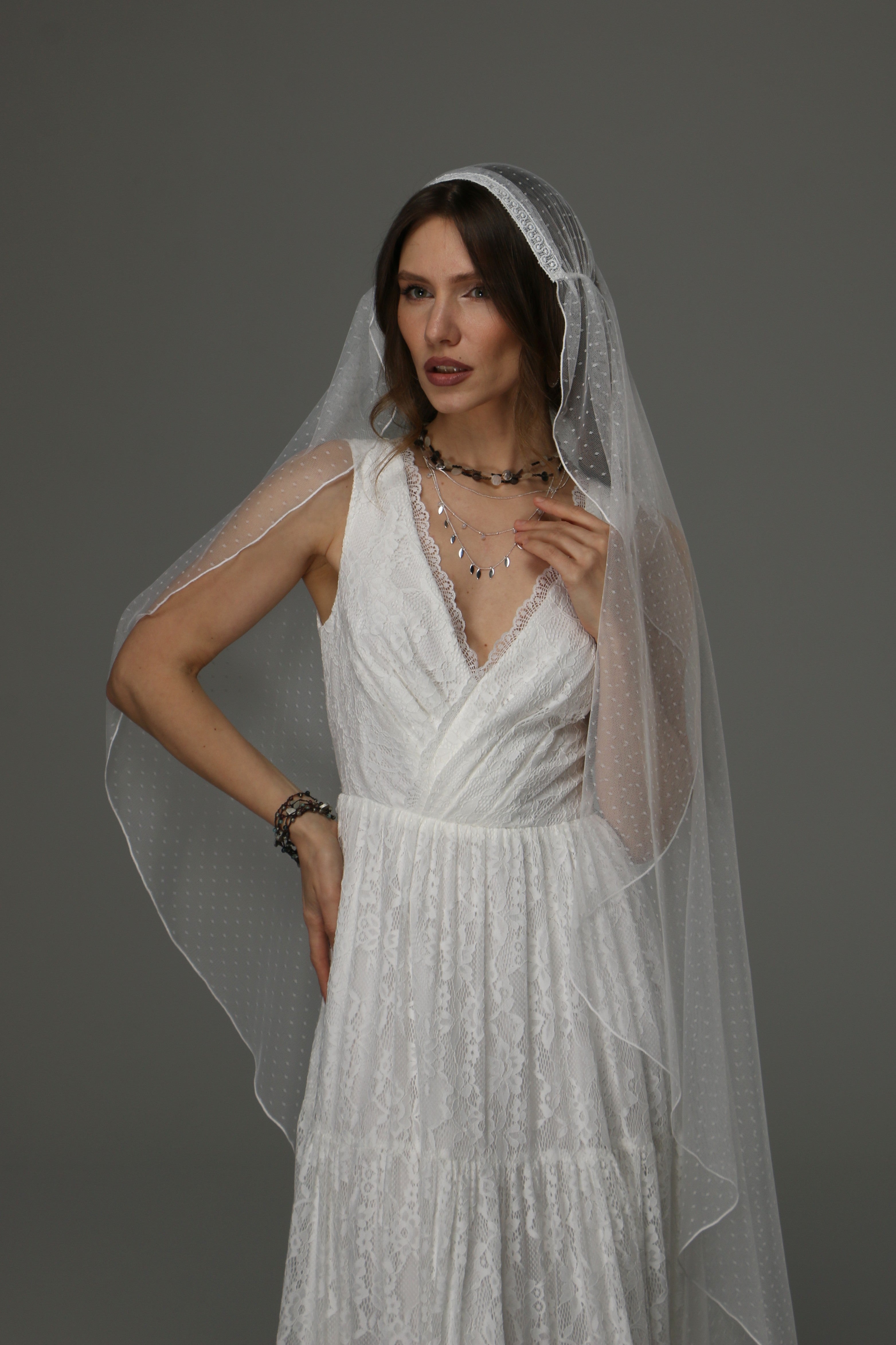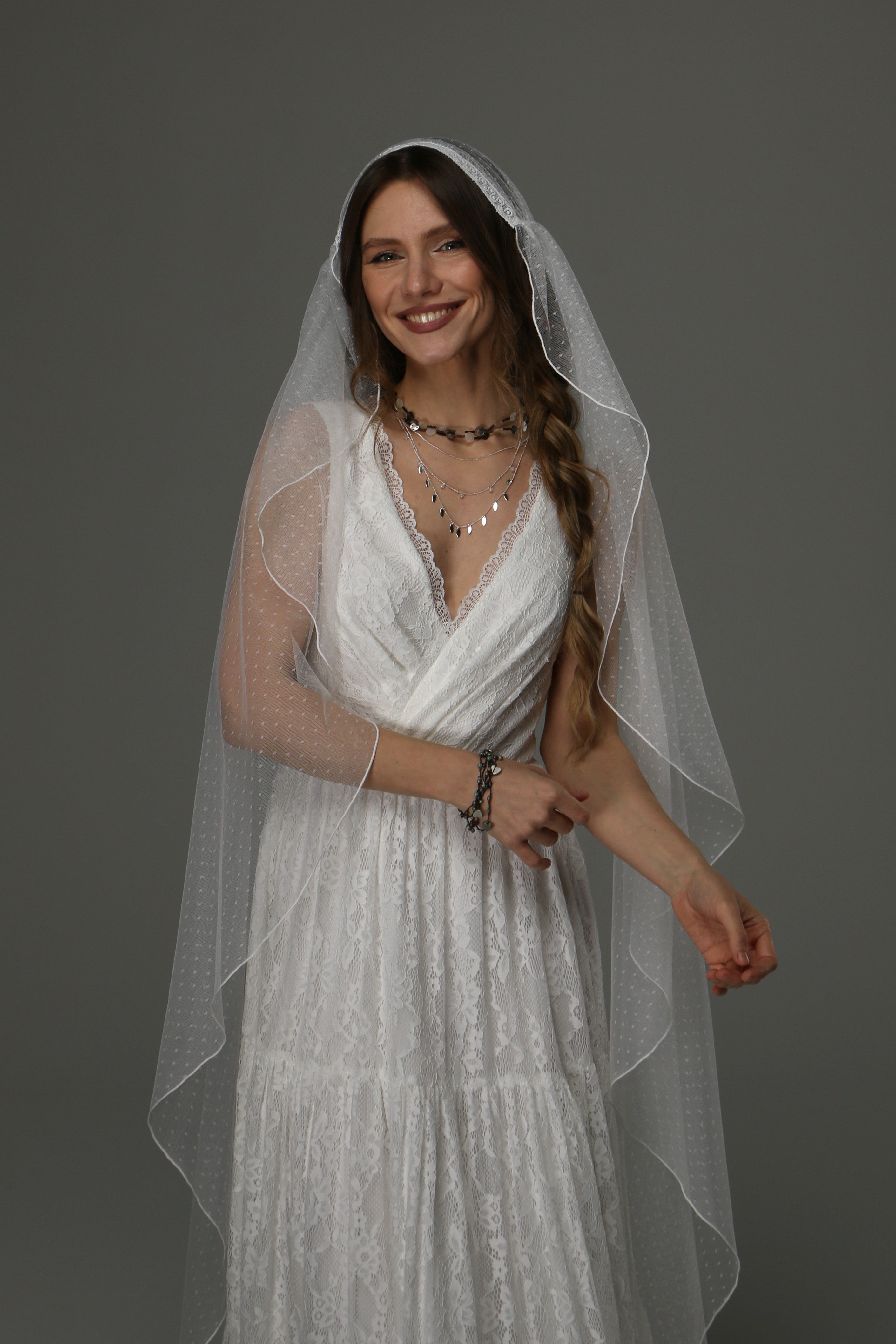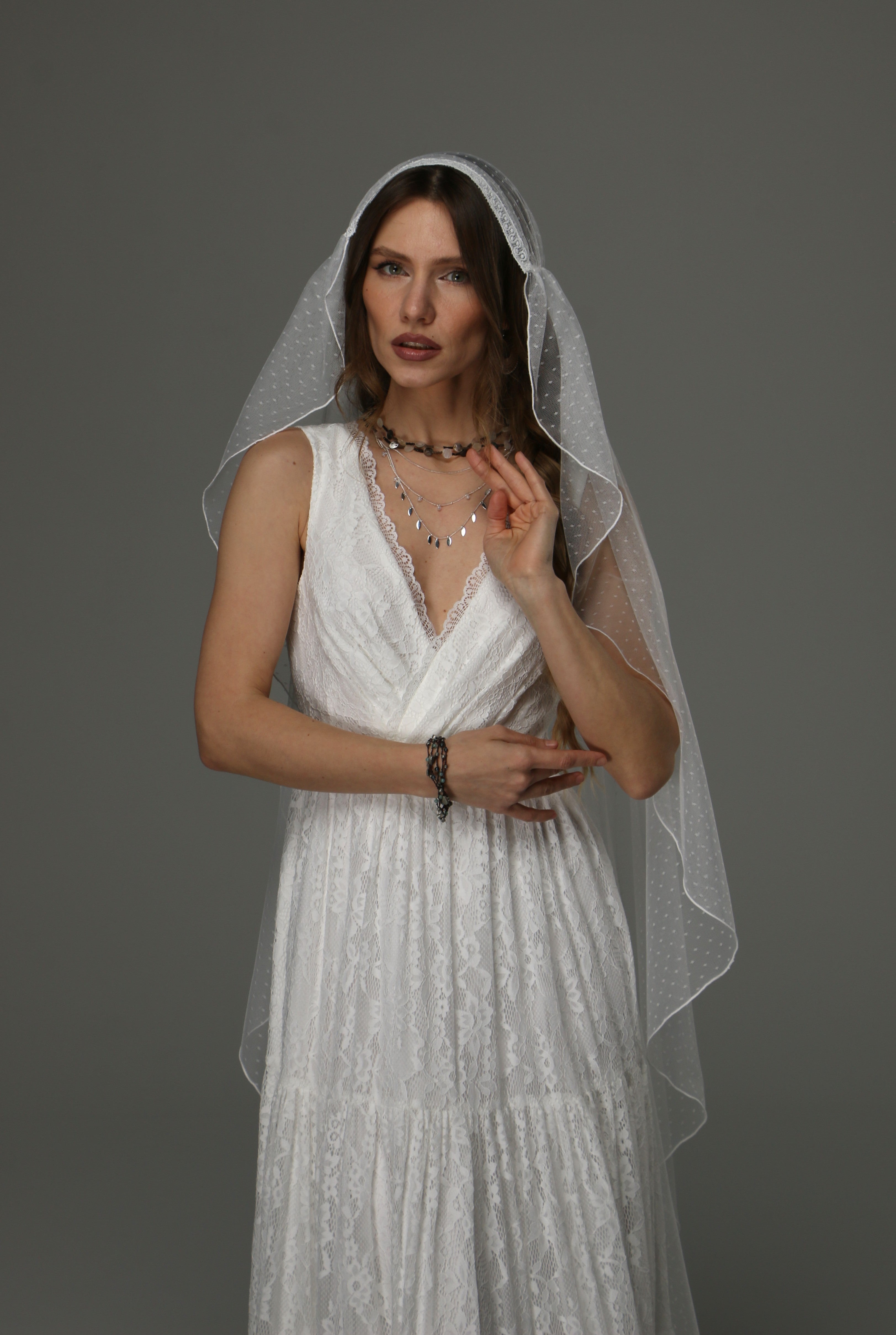 Boho Juliet Cap Wedding Veil with Lace Dotted Tulle Bridal Veil with Pencil Edge – Vintage Bohemian Style This Boho...