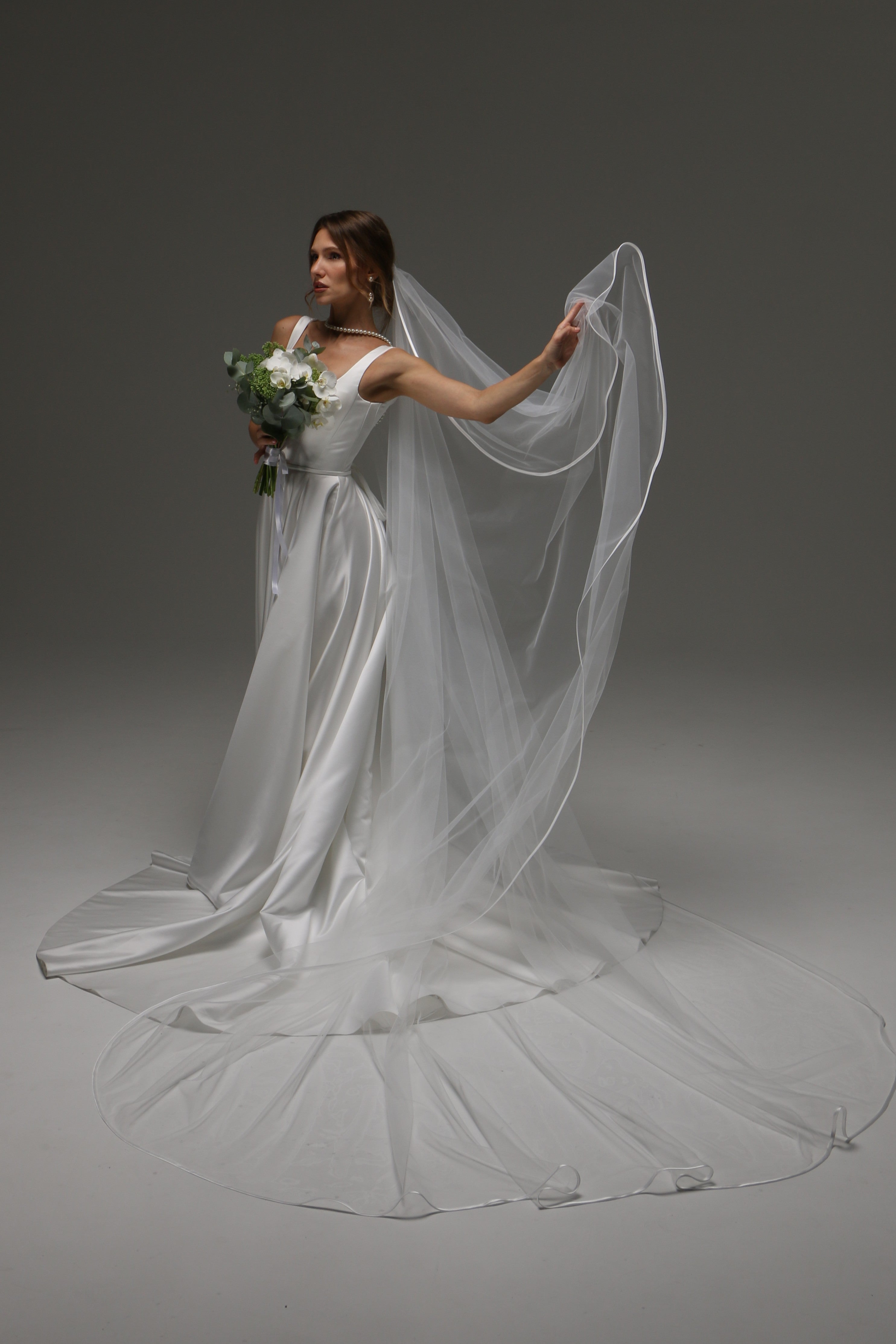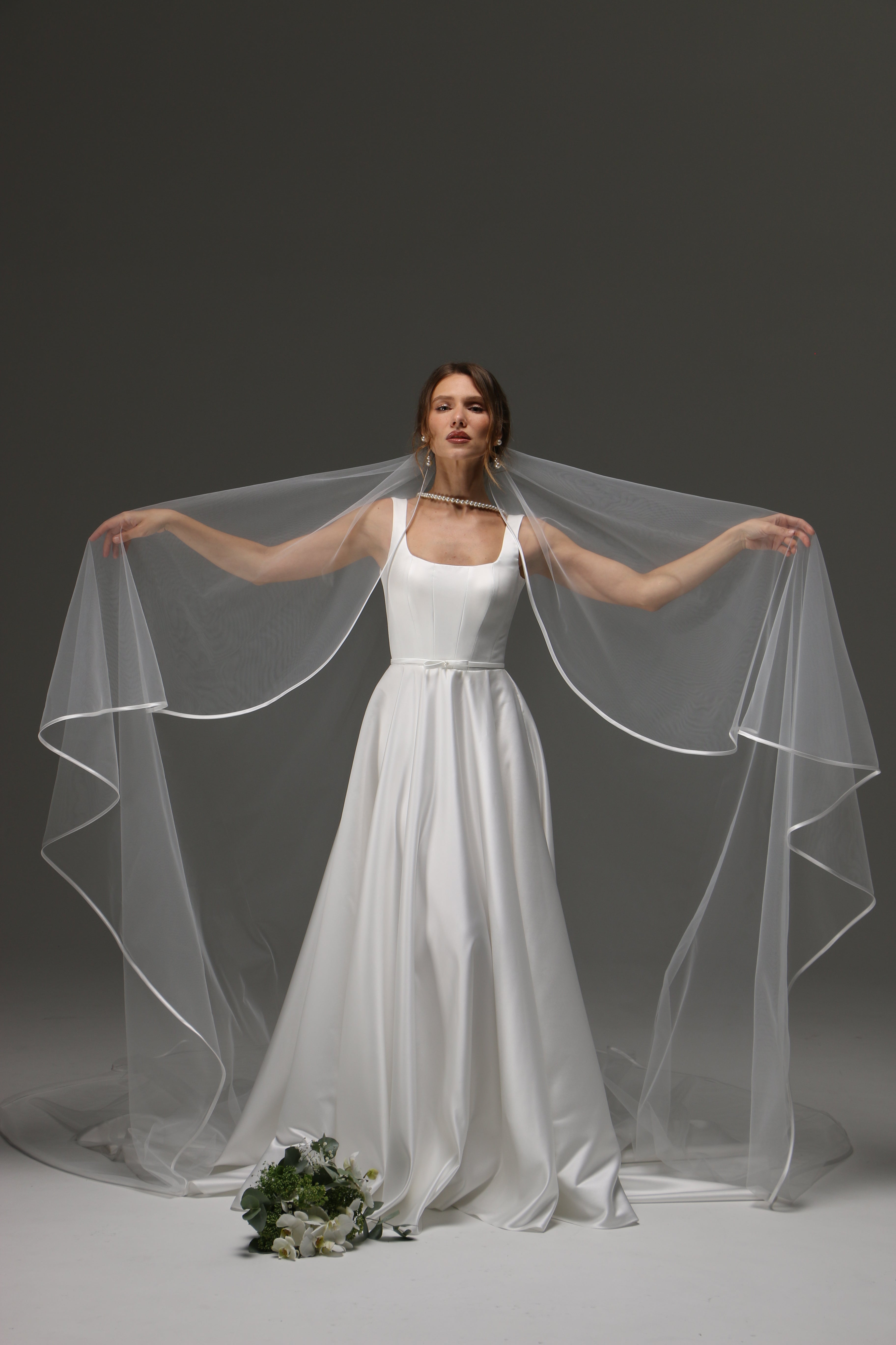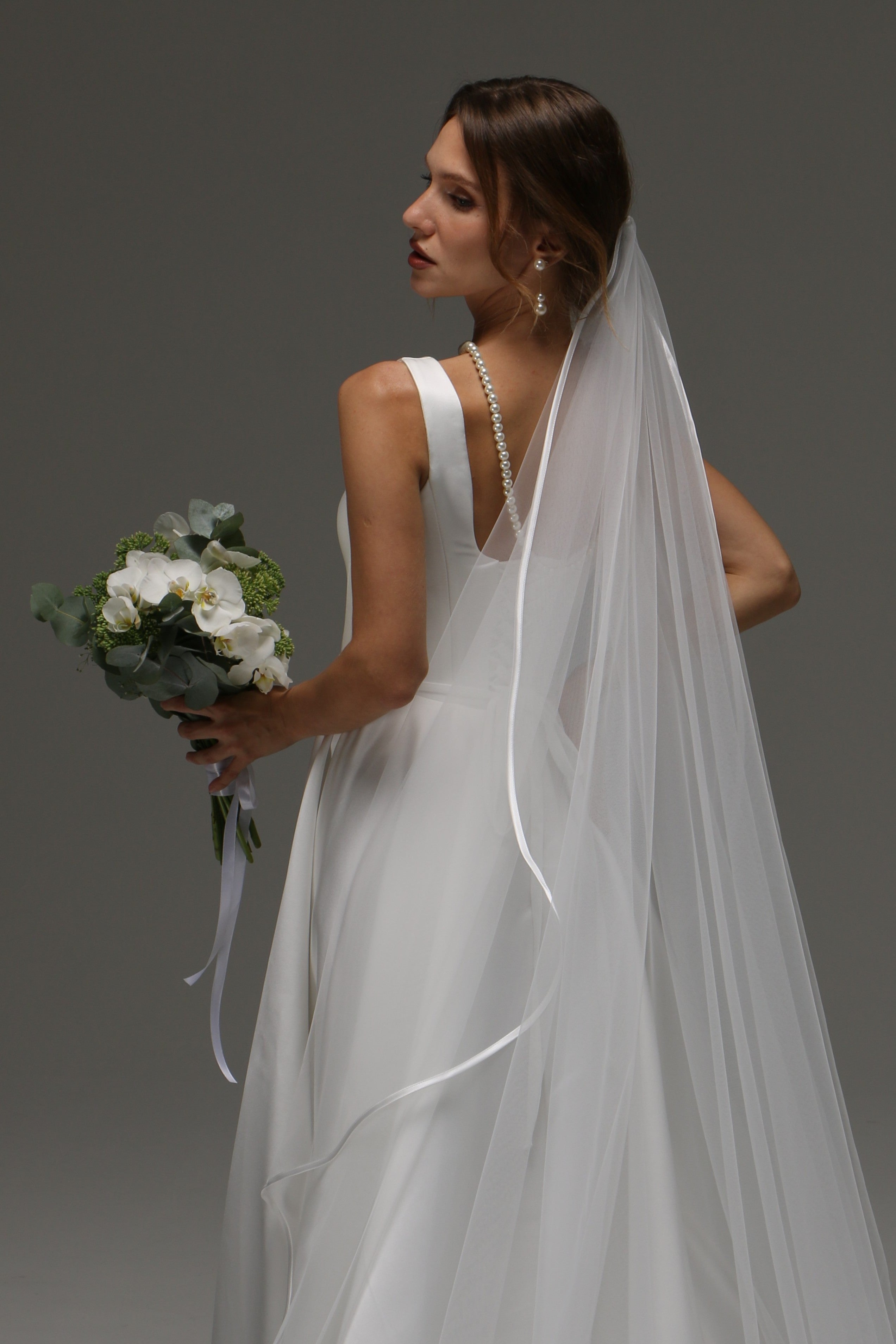 Cascading One Tier Satin Ribbon Wedding Veil, Simple Elegant Bridal Veil with Satin Edge, Knee Length or Short Veil for Bride