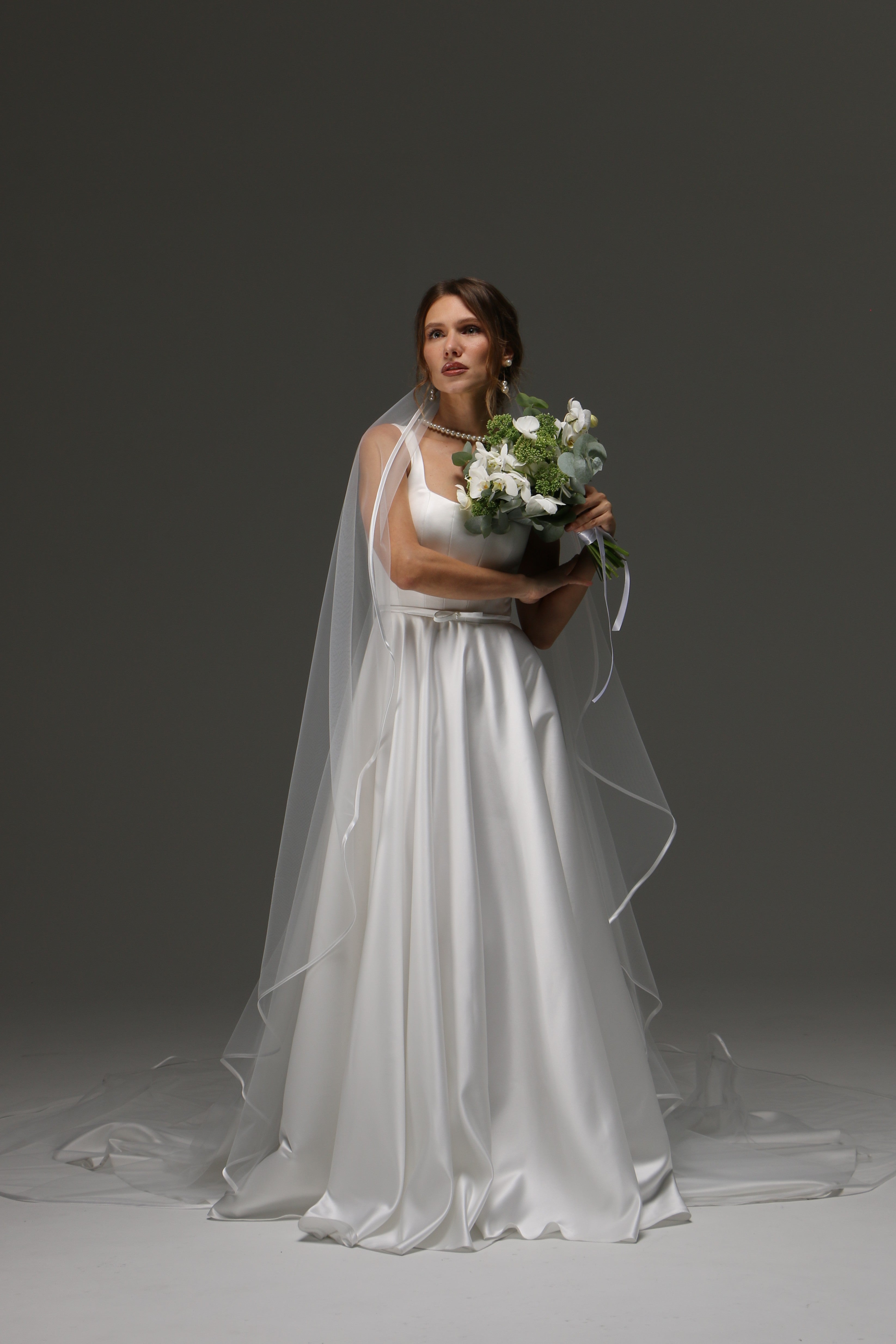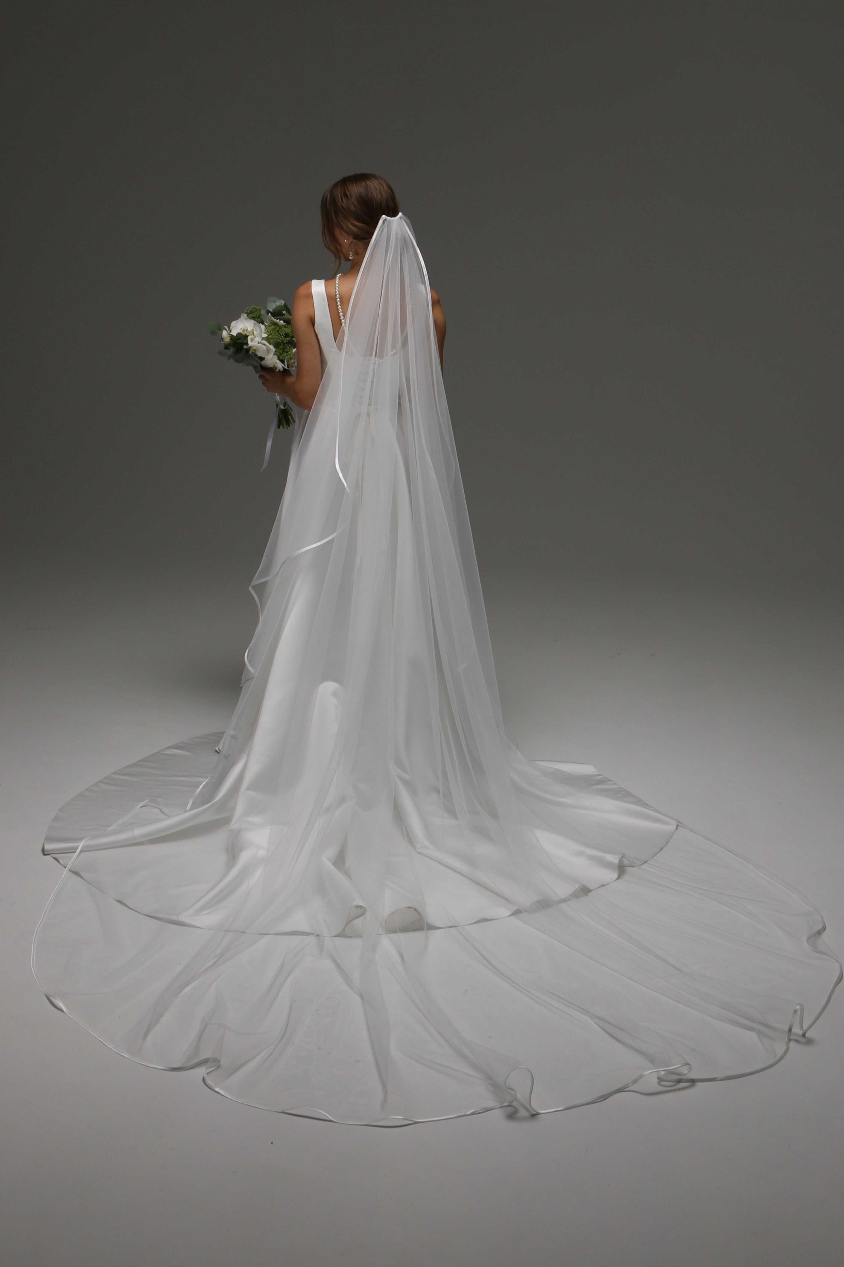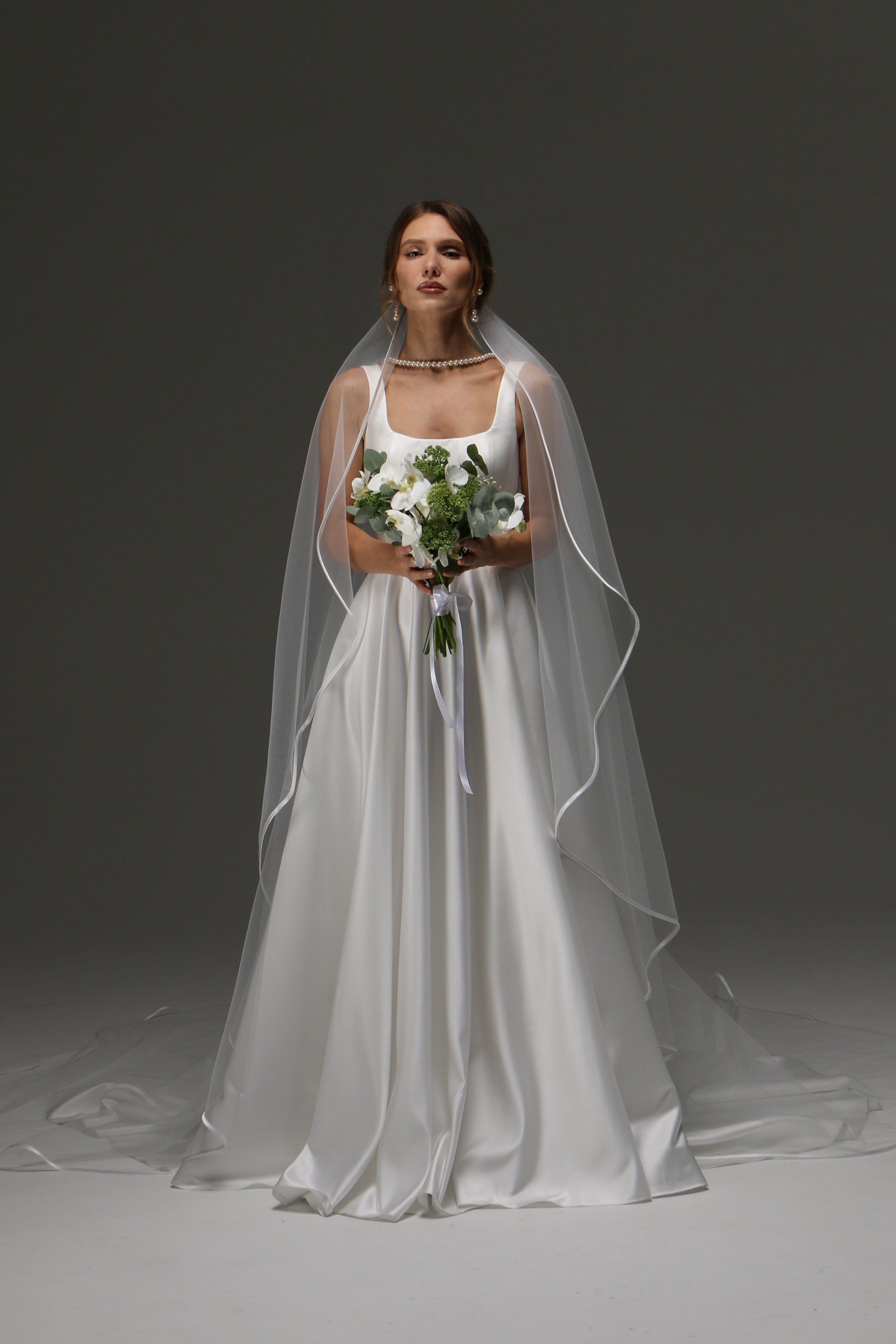 Cascading One Tier Satin Ribbon Wedding Veil, Simple Elegant Bridal Veil with Satin Edge, Knee Length or Short Veil for Bride