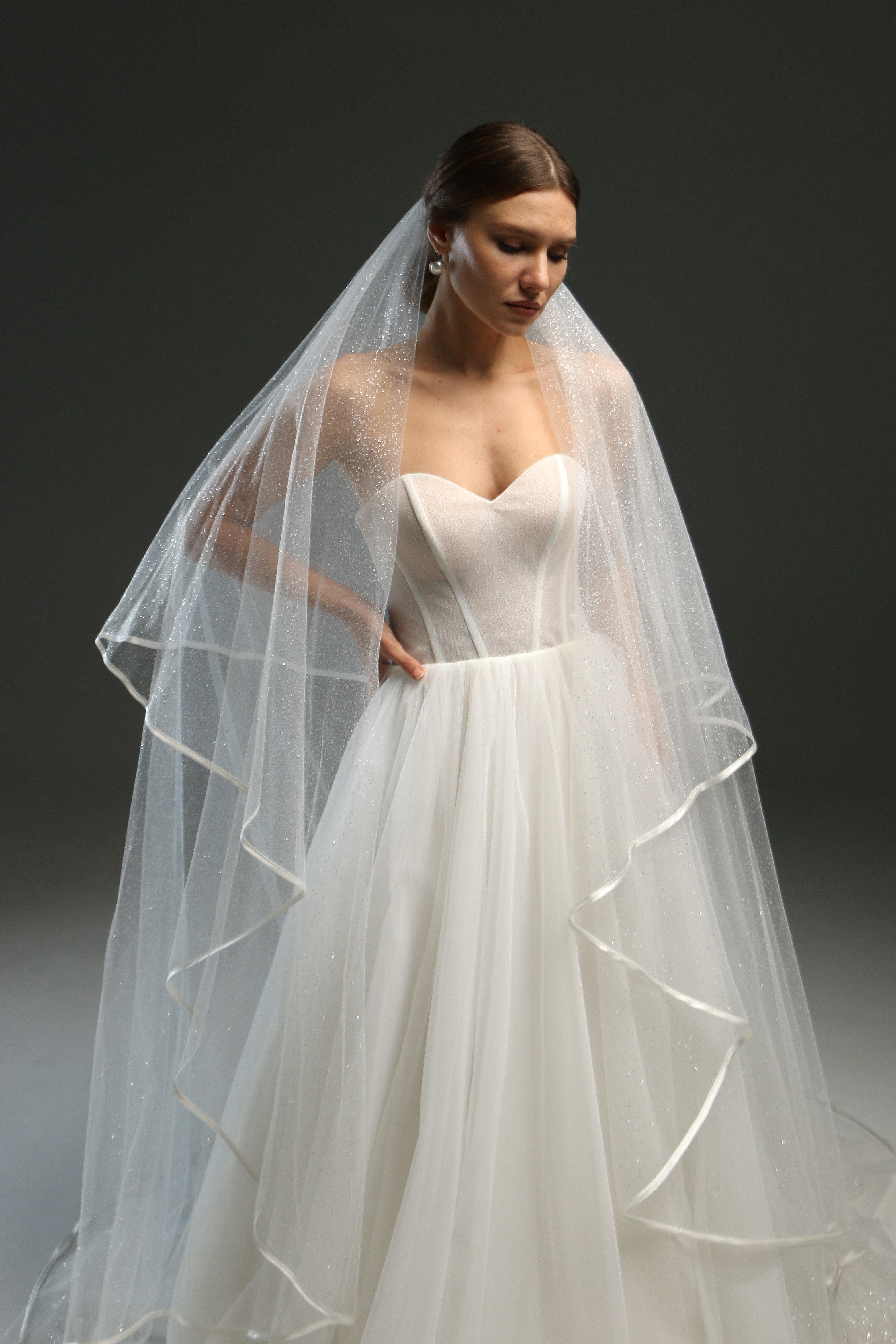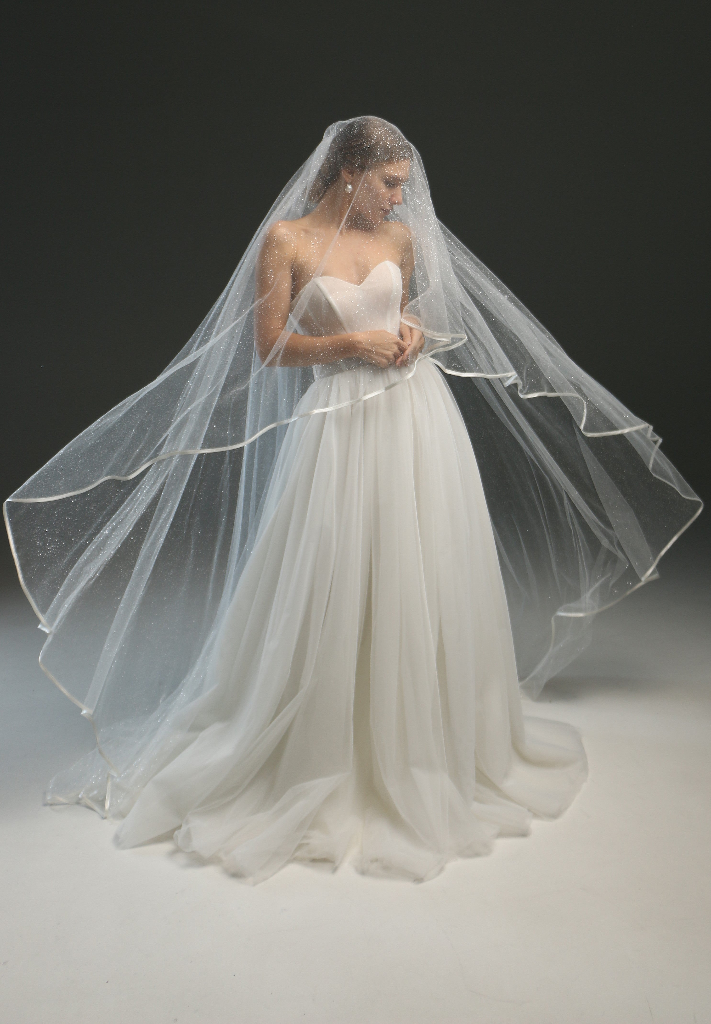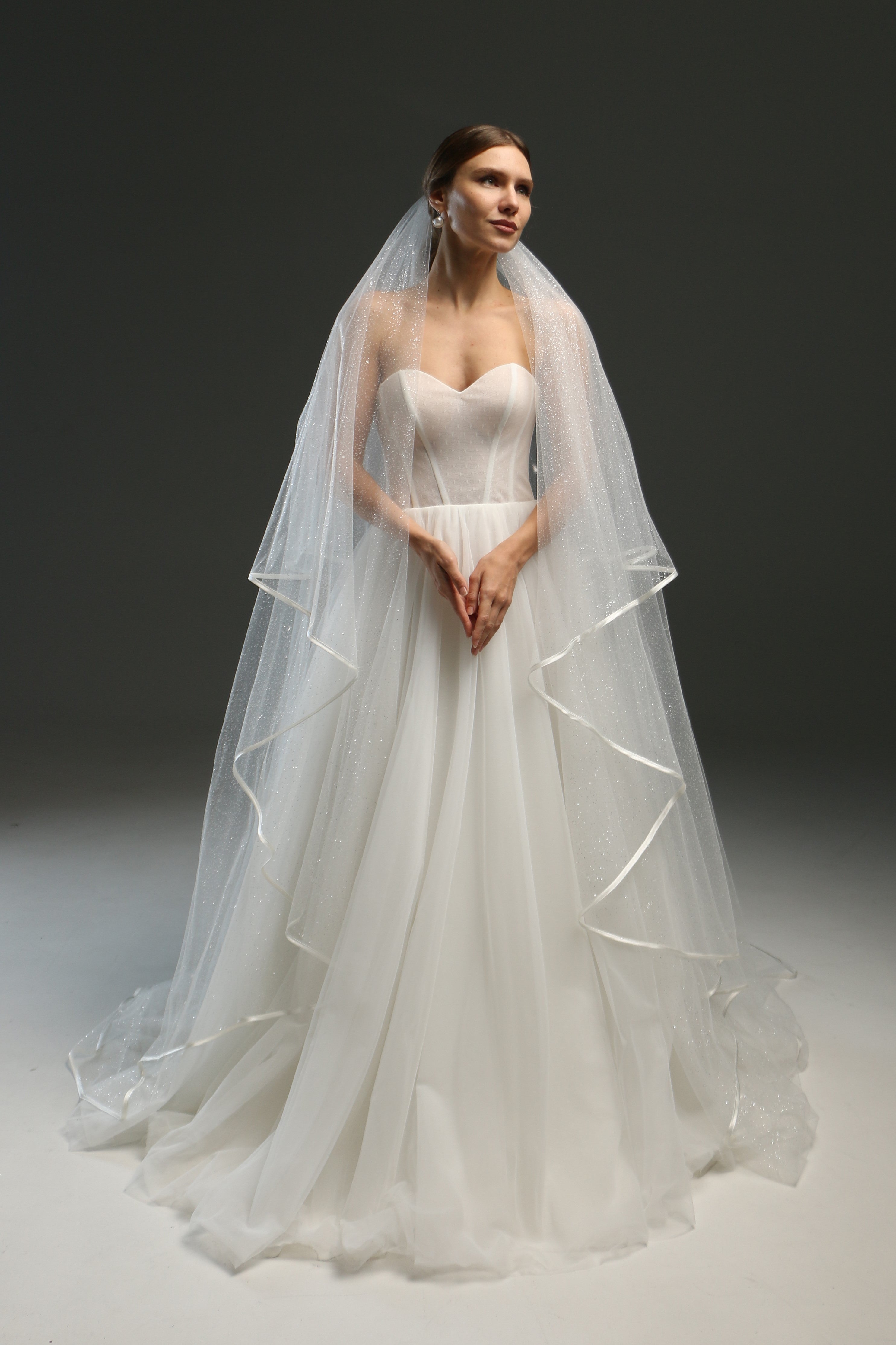 Classic Chapel Wedding Veil with Satin Edge, Glitter, and Ribbon - Long Bridal Veil