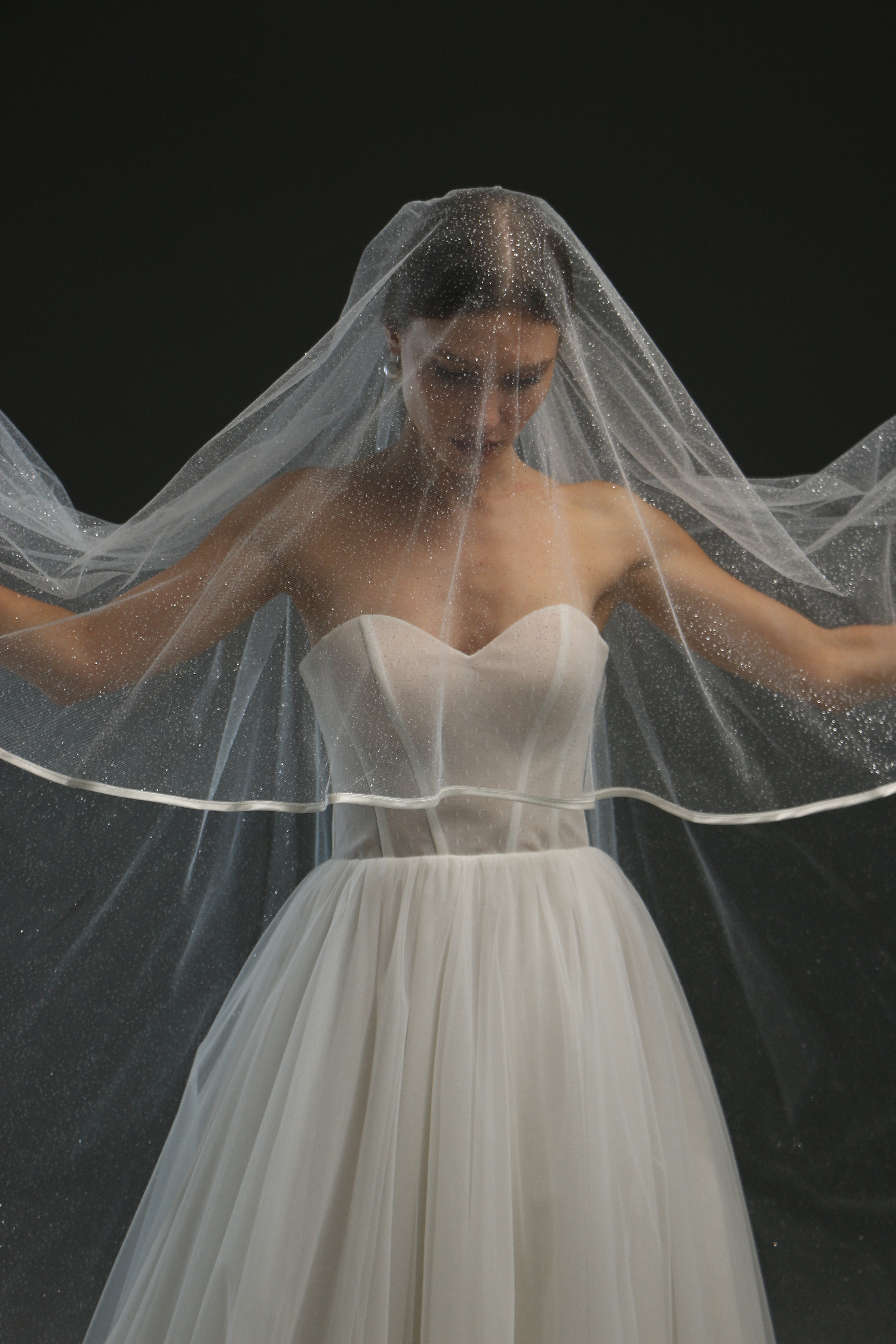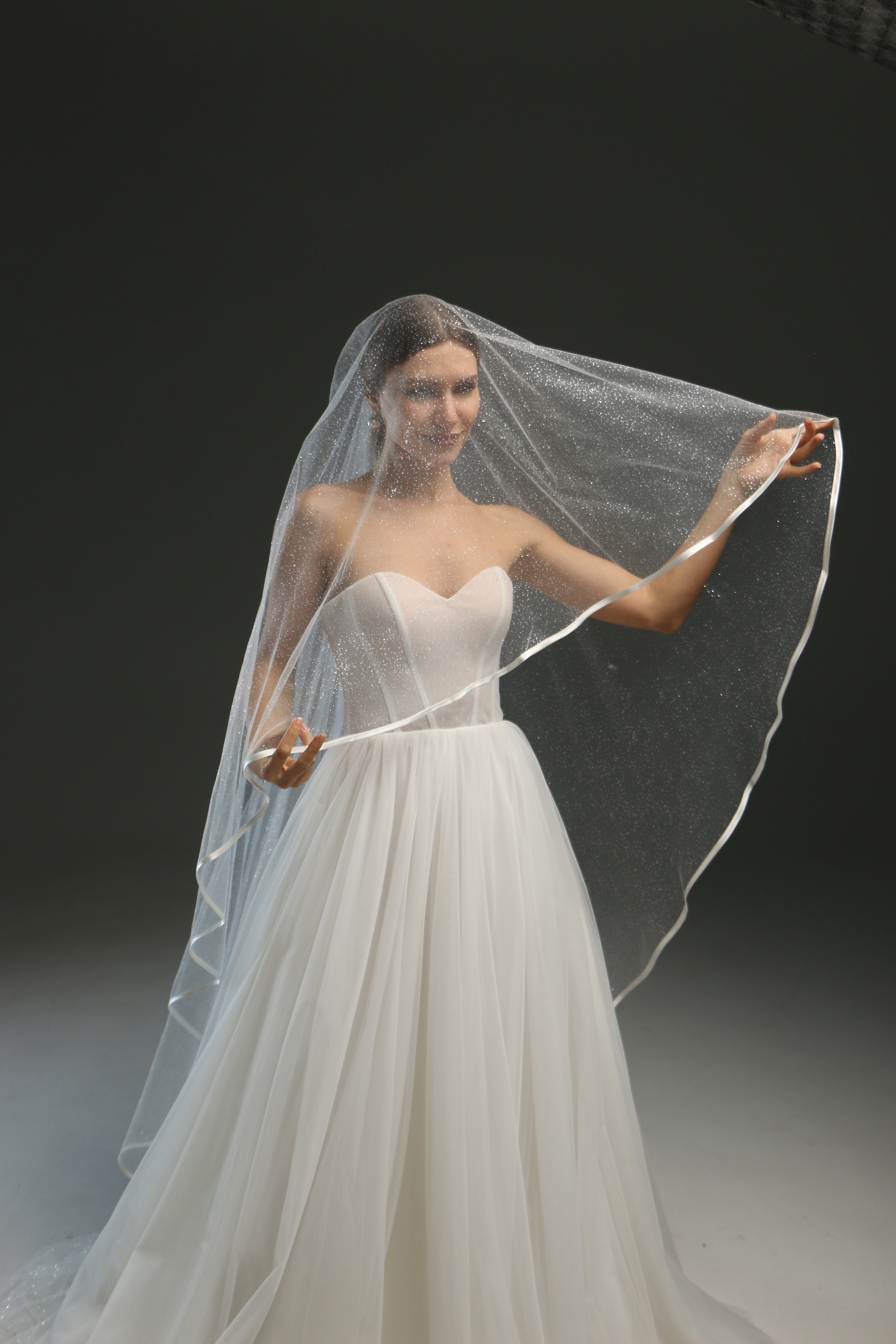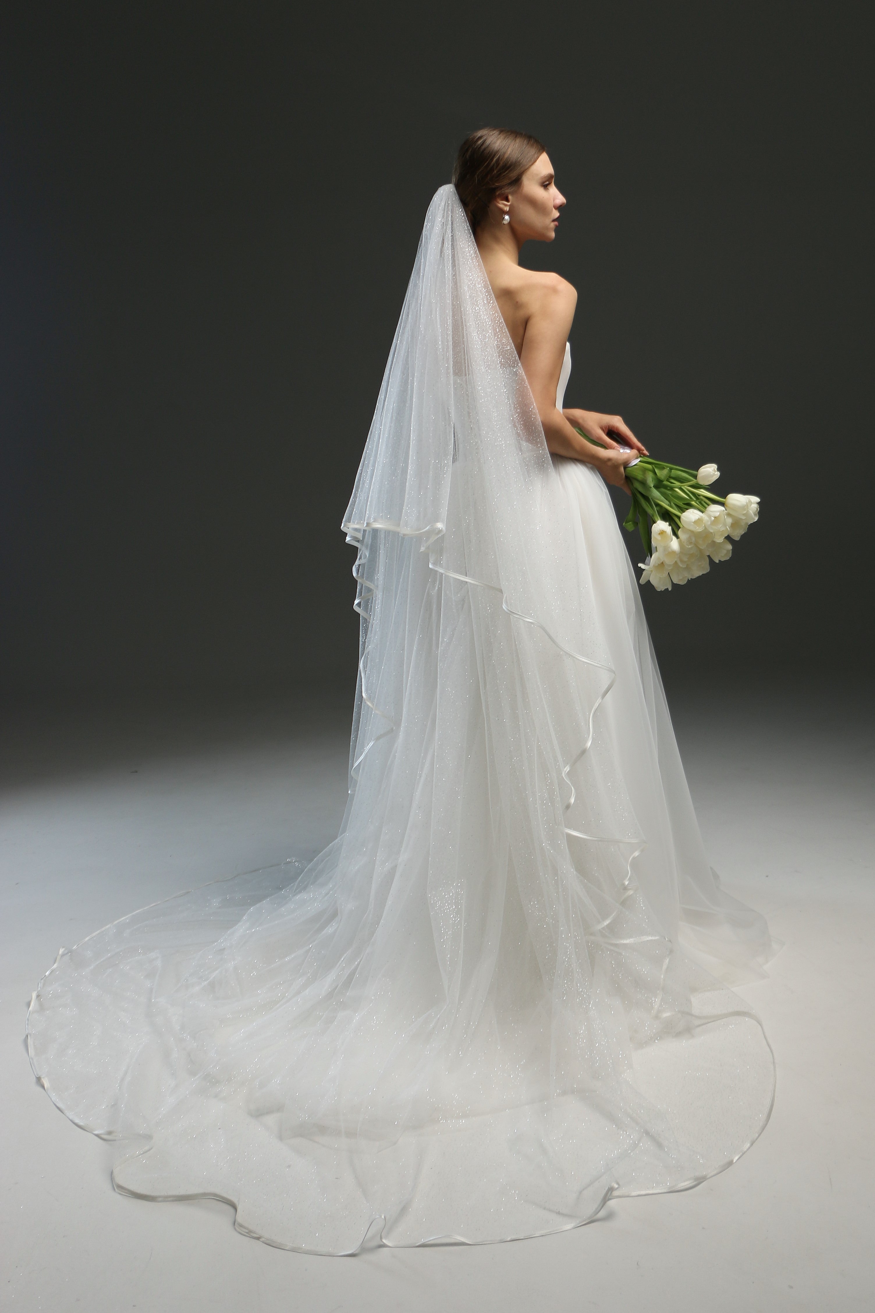 Classic Chapel Wedding Veil with Satin Edge, Glitter, and Ribbon - Long Bridal Veil