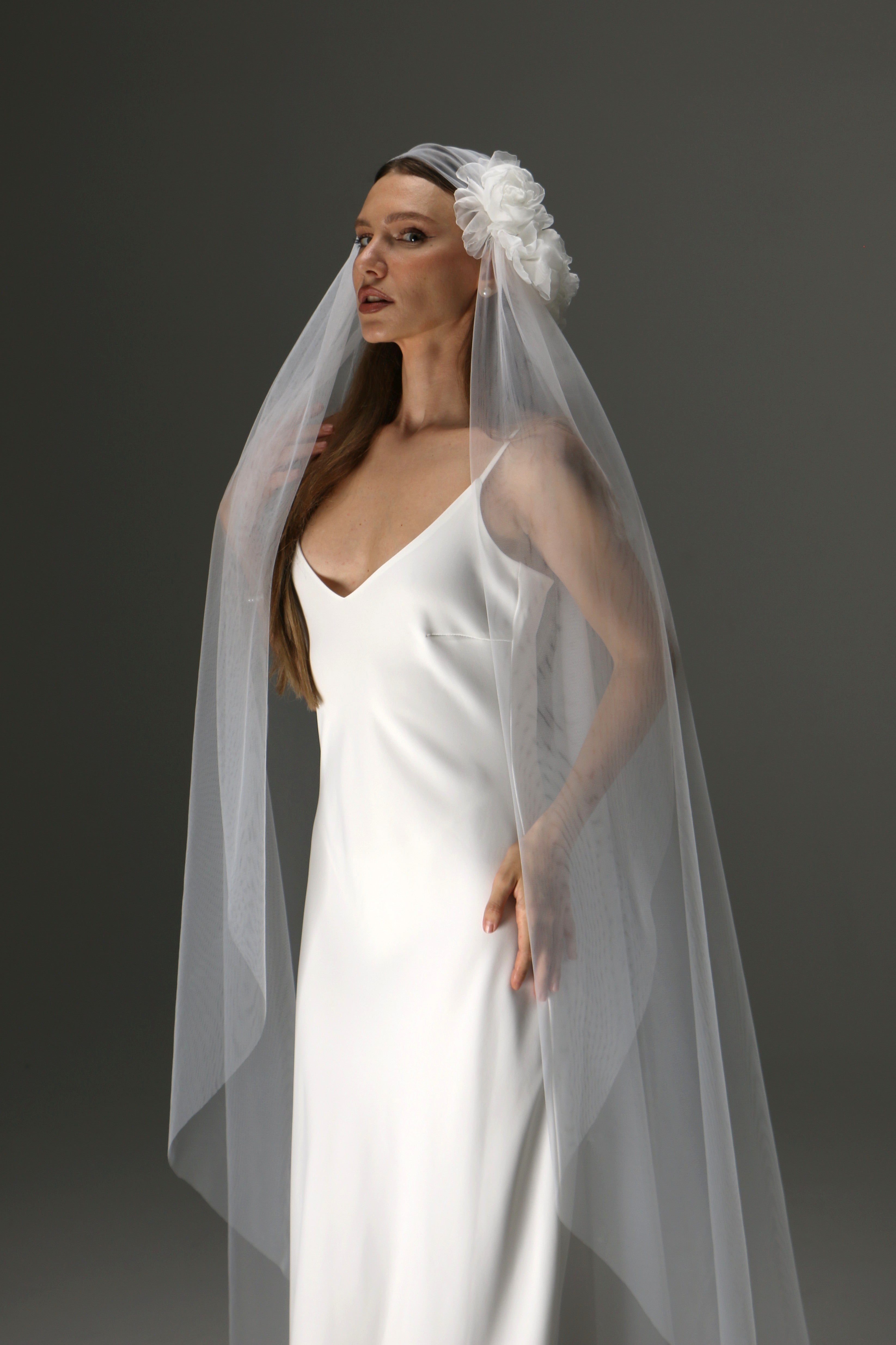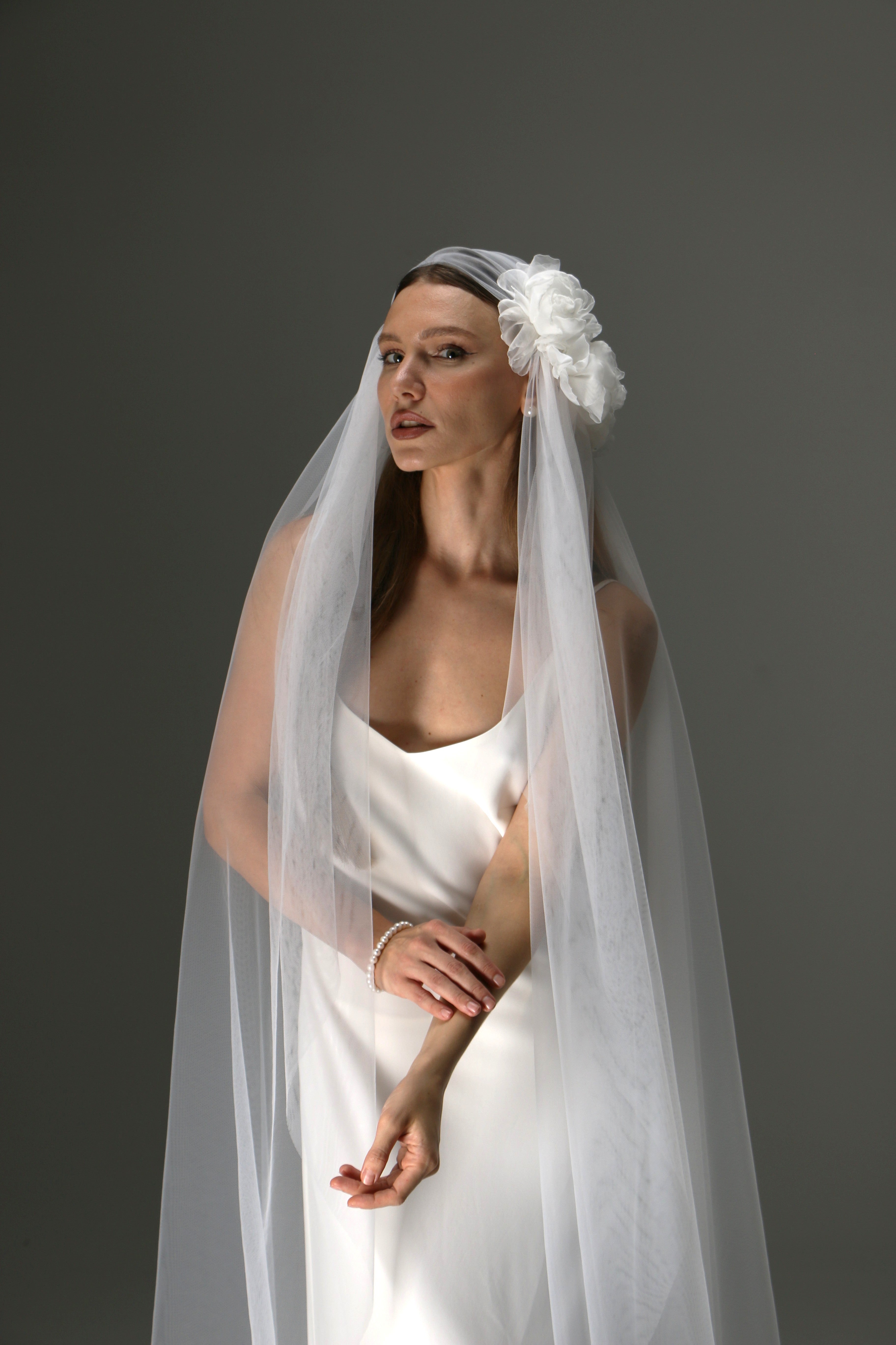 Juliet Cap Veil with Side Flower – One Tier Cascade Soft Tulle Long Bridal Veil