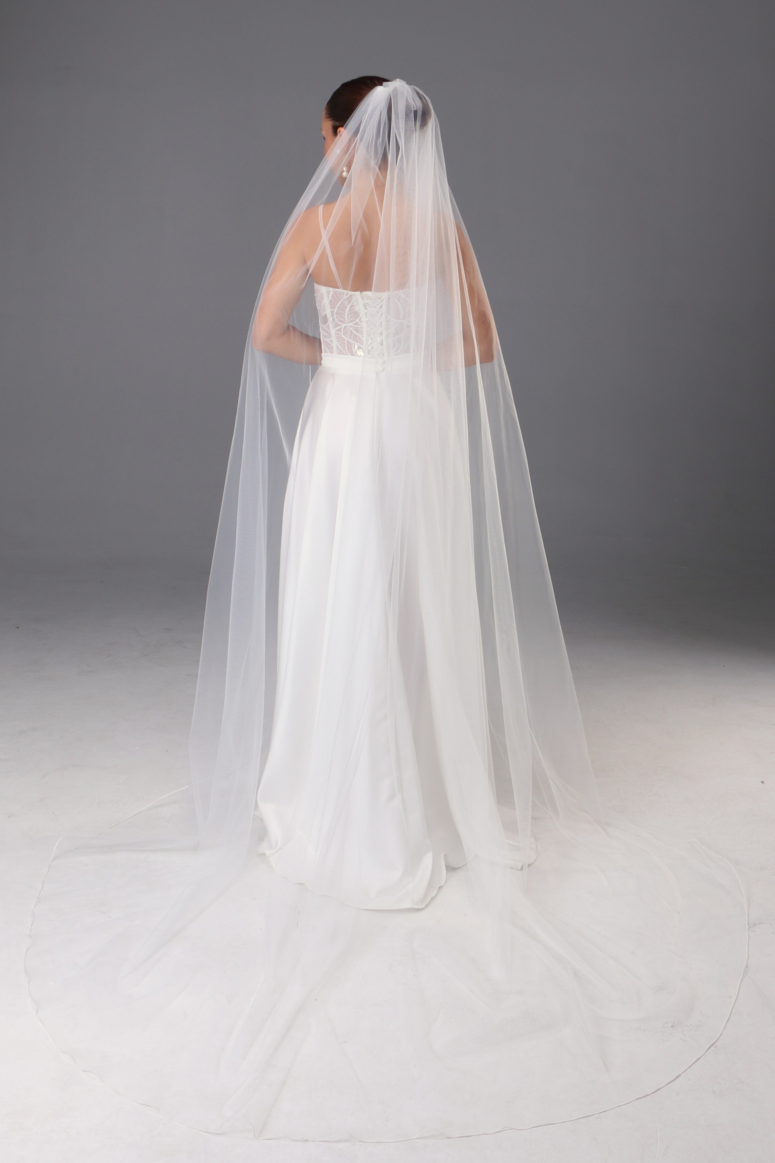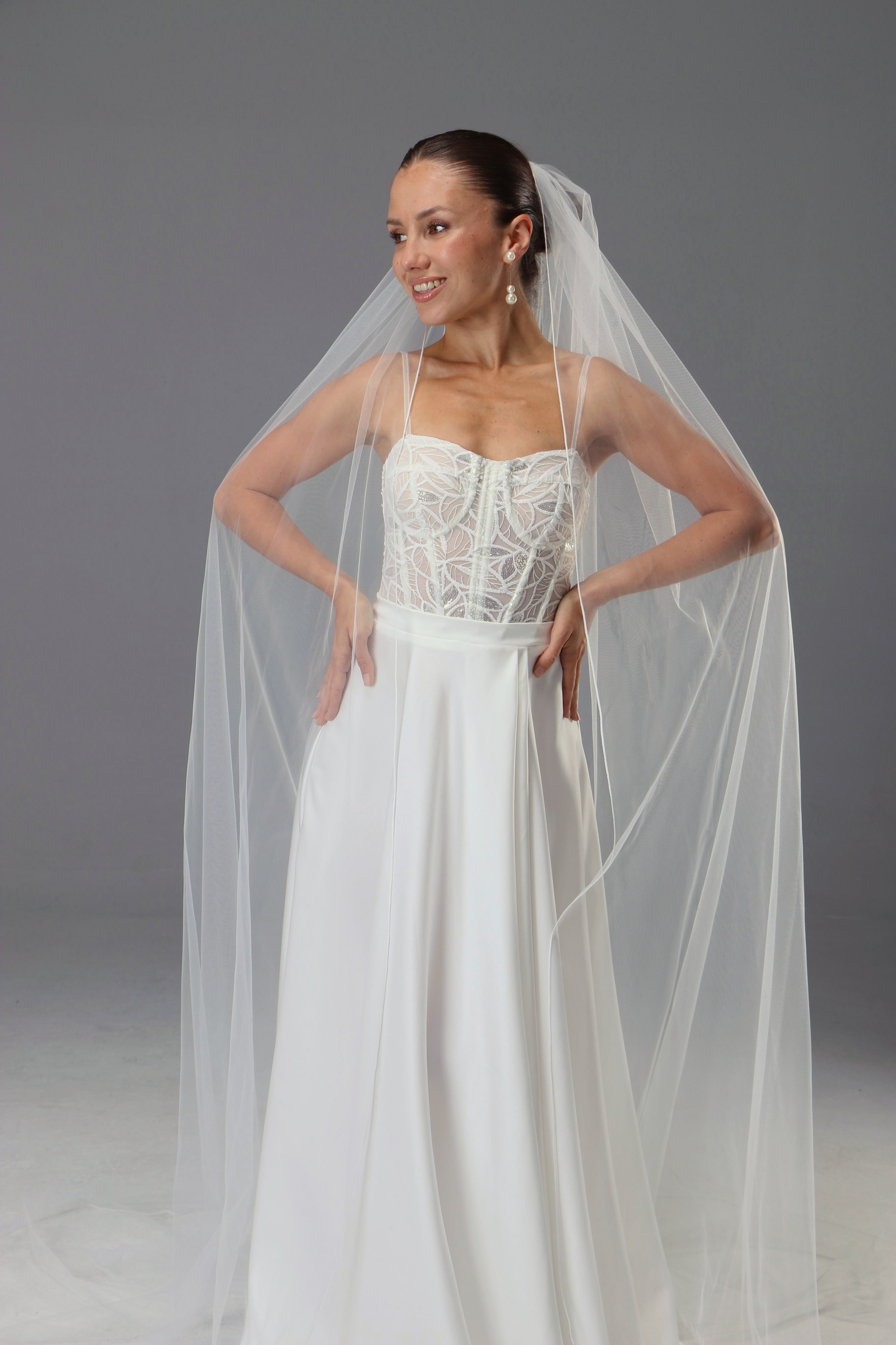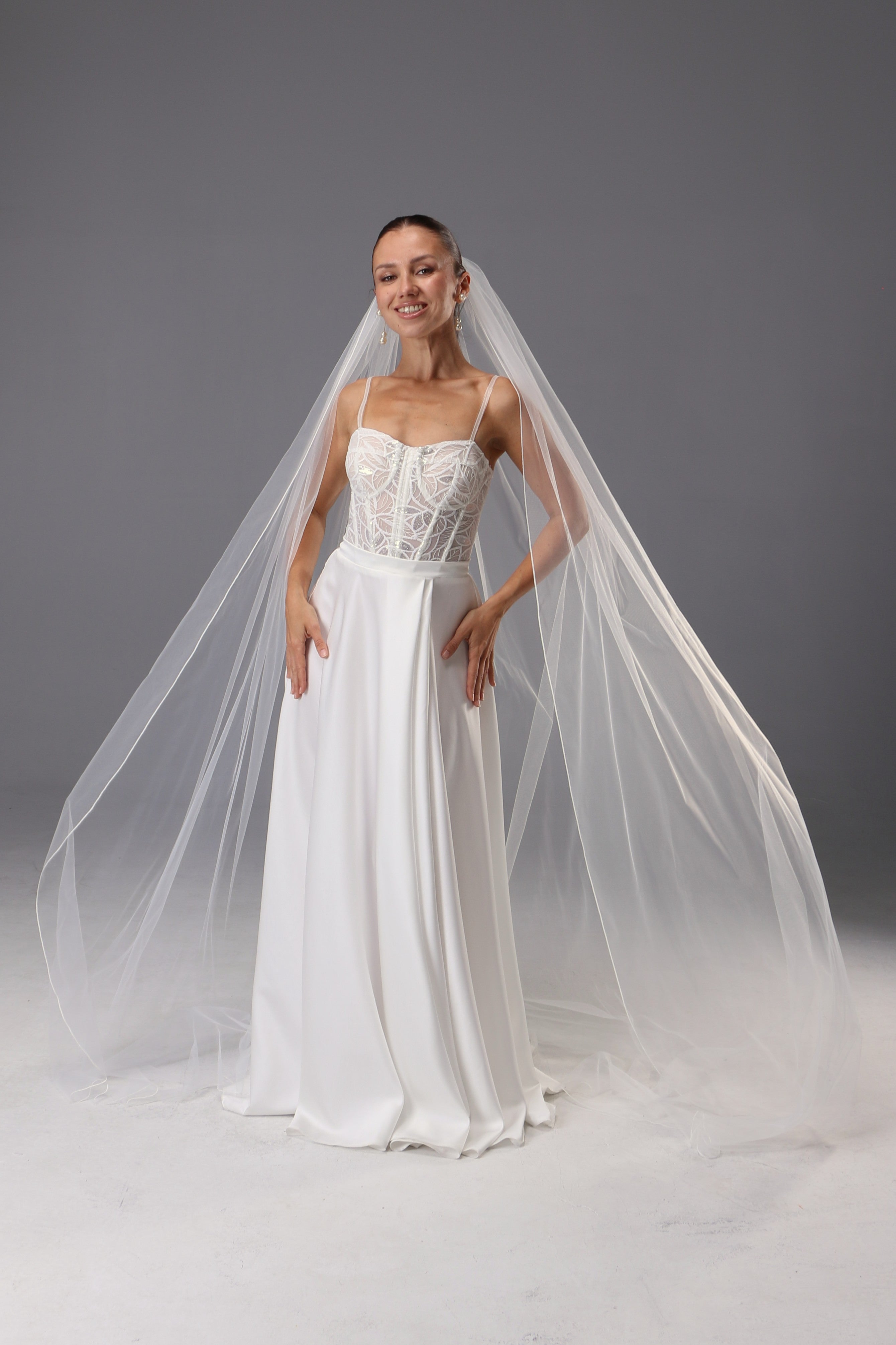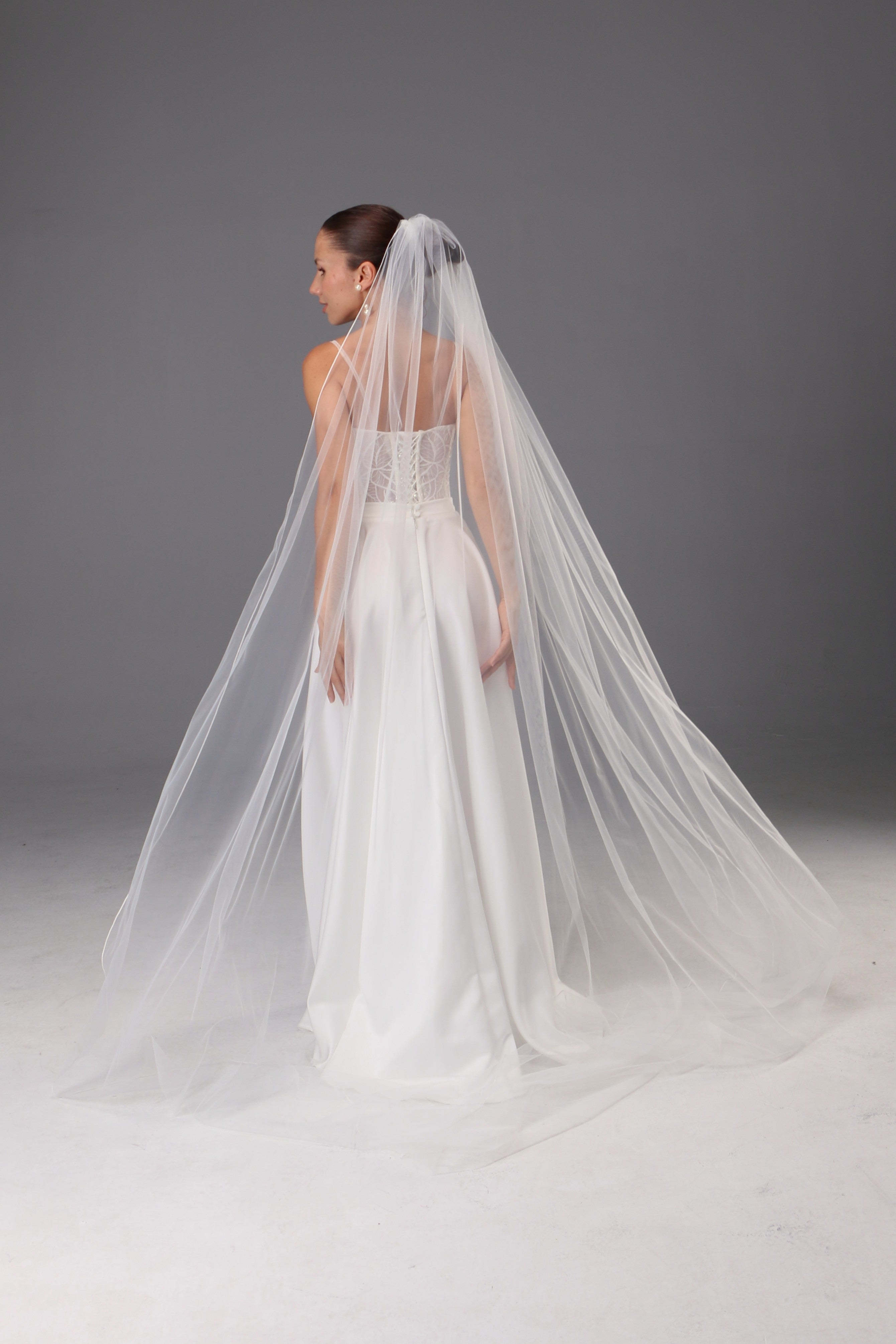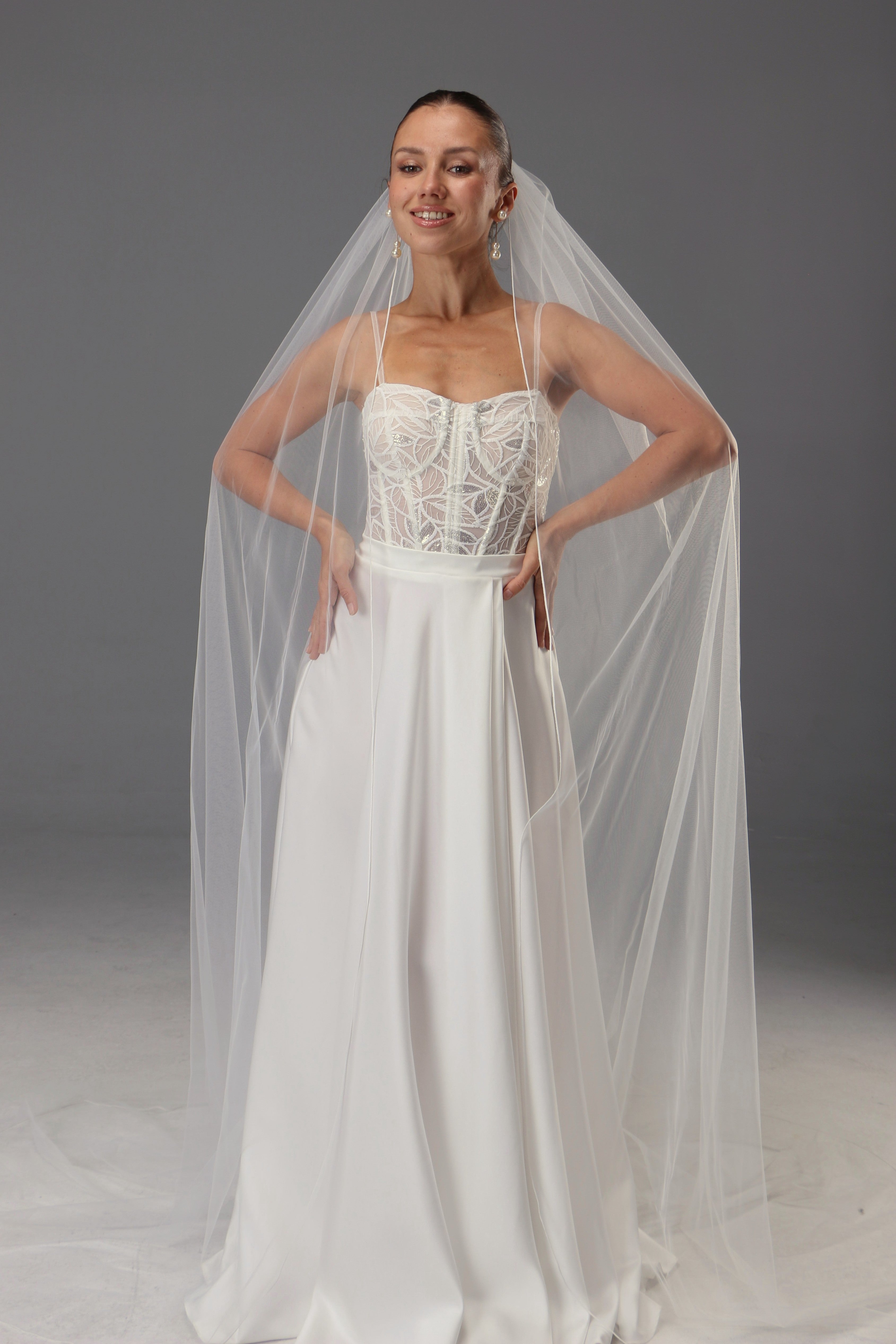 This one-tier long wedding veil is crafted from luxuriously soft Italian tulle in a delicate light ivory shade. The fabric...