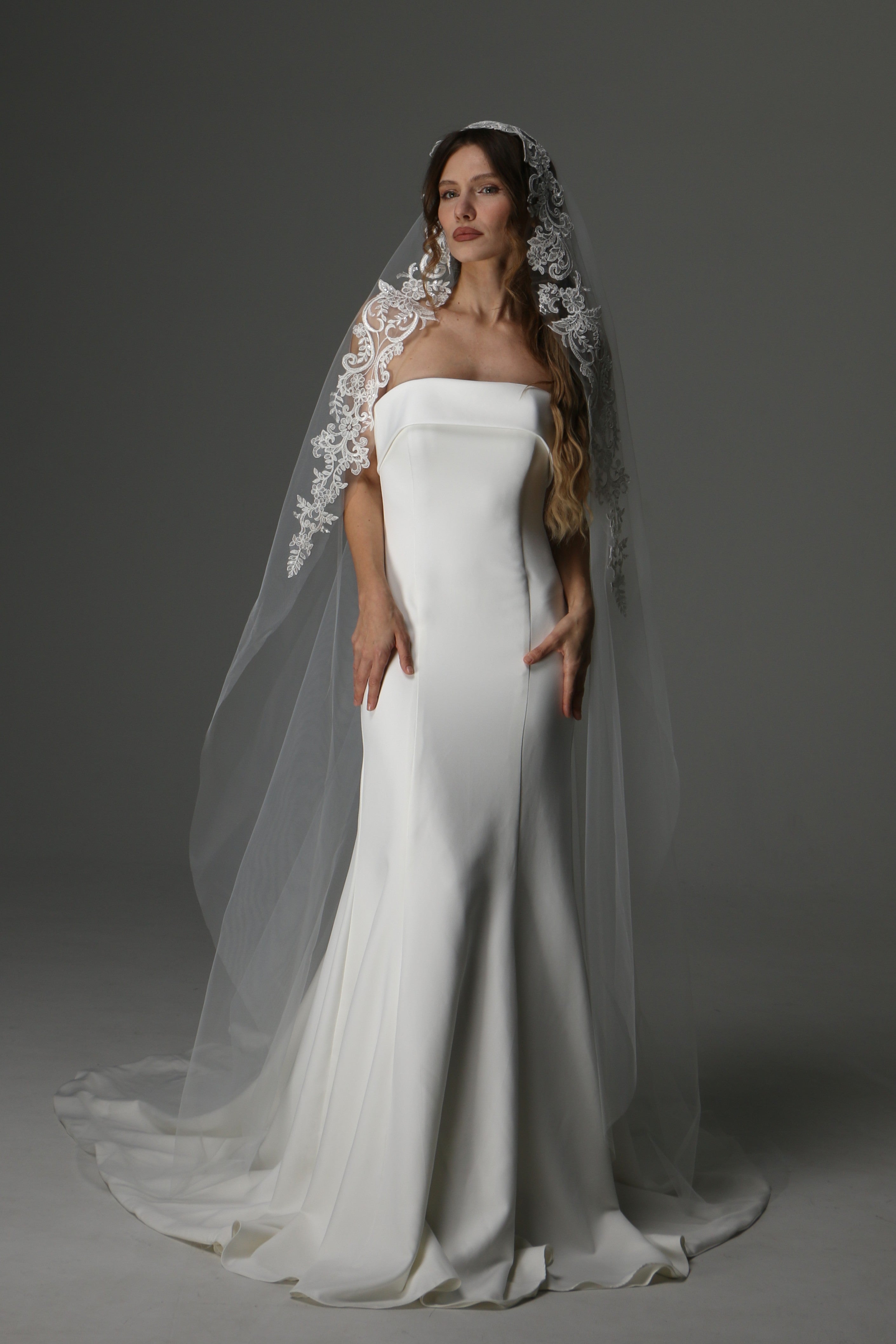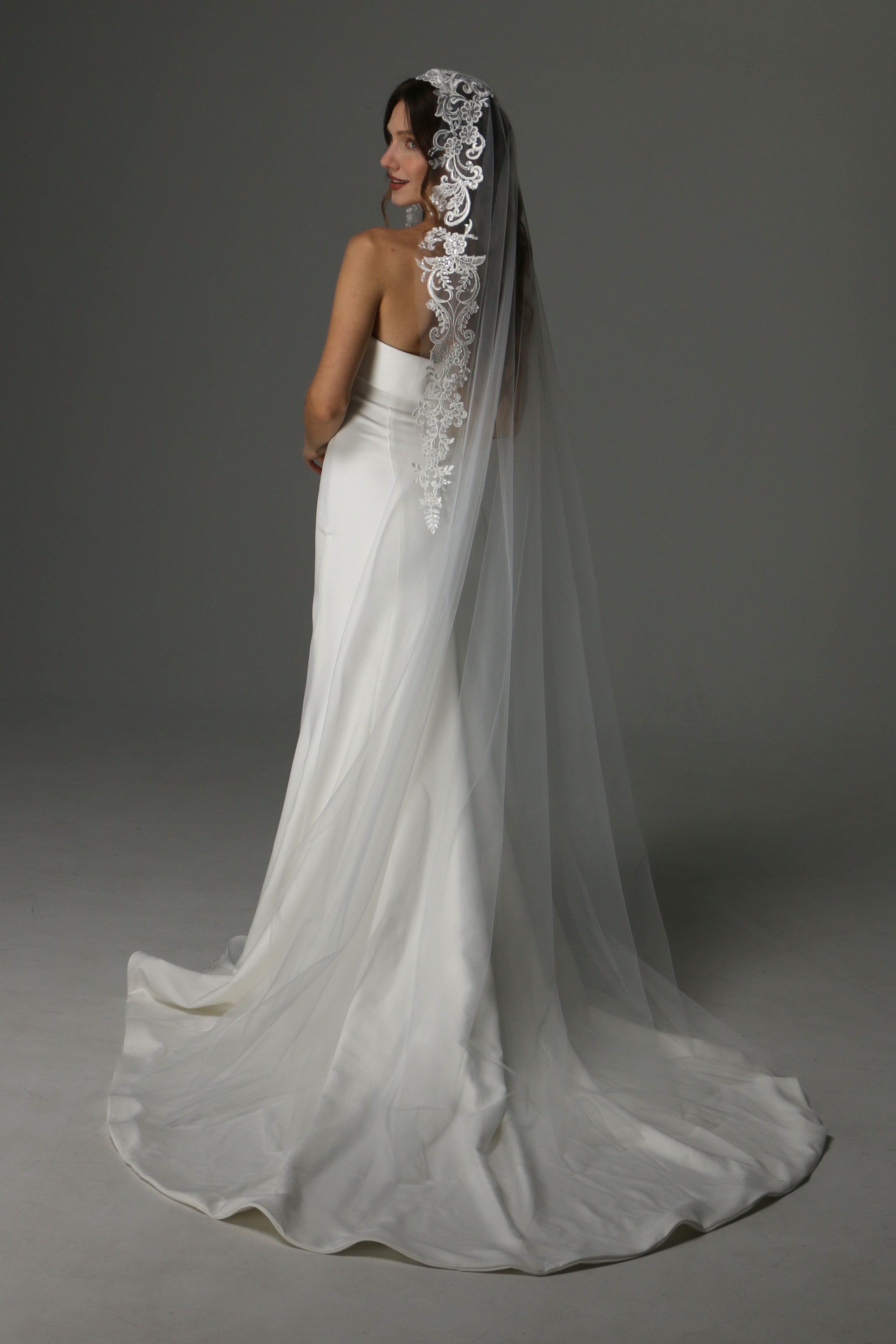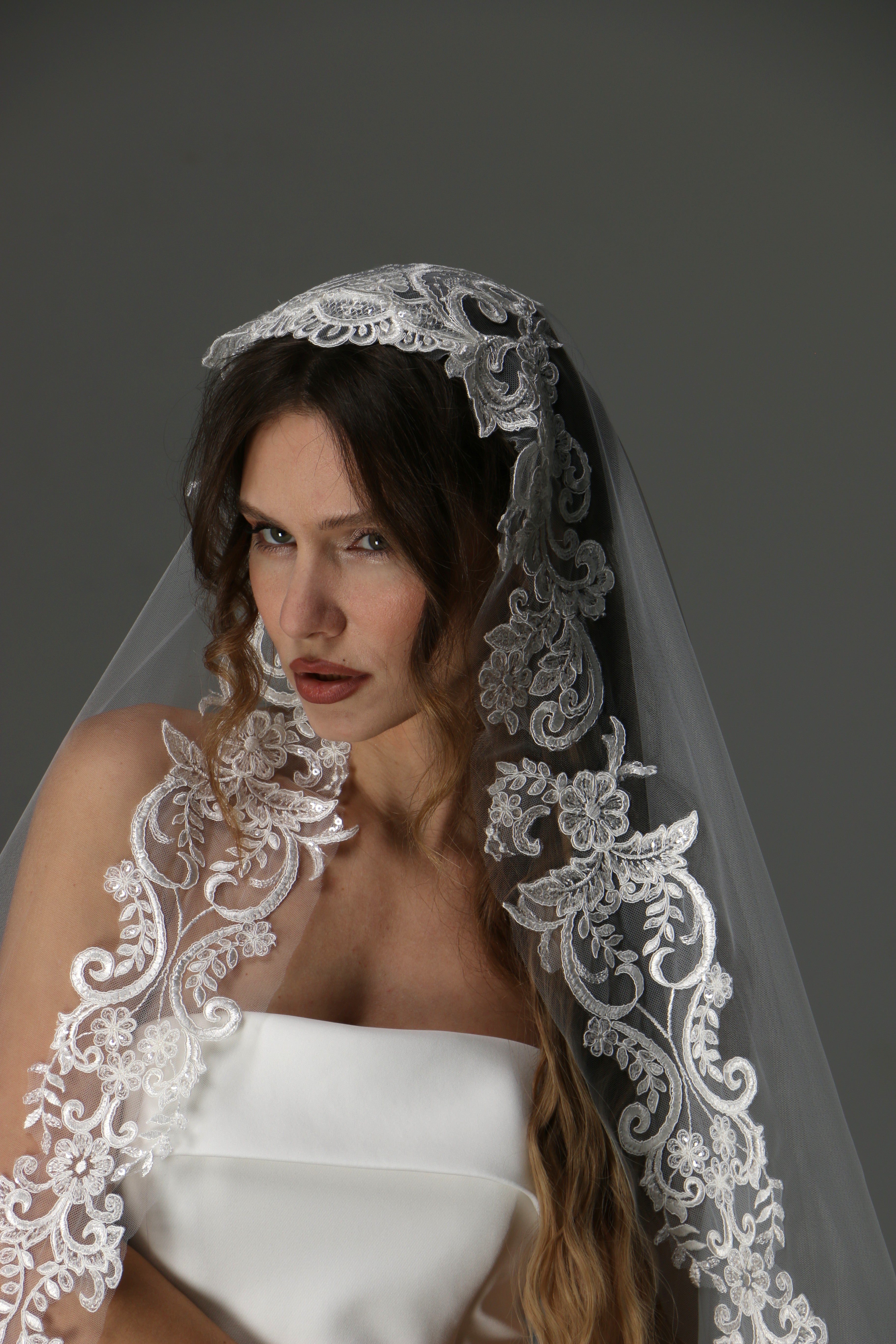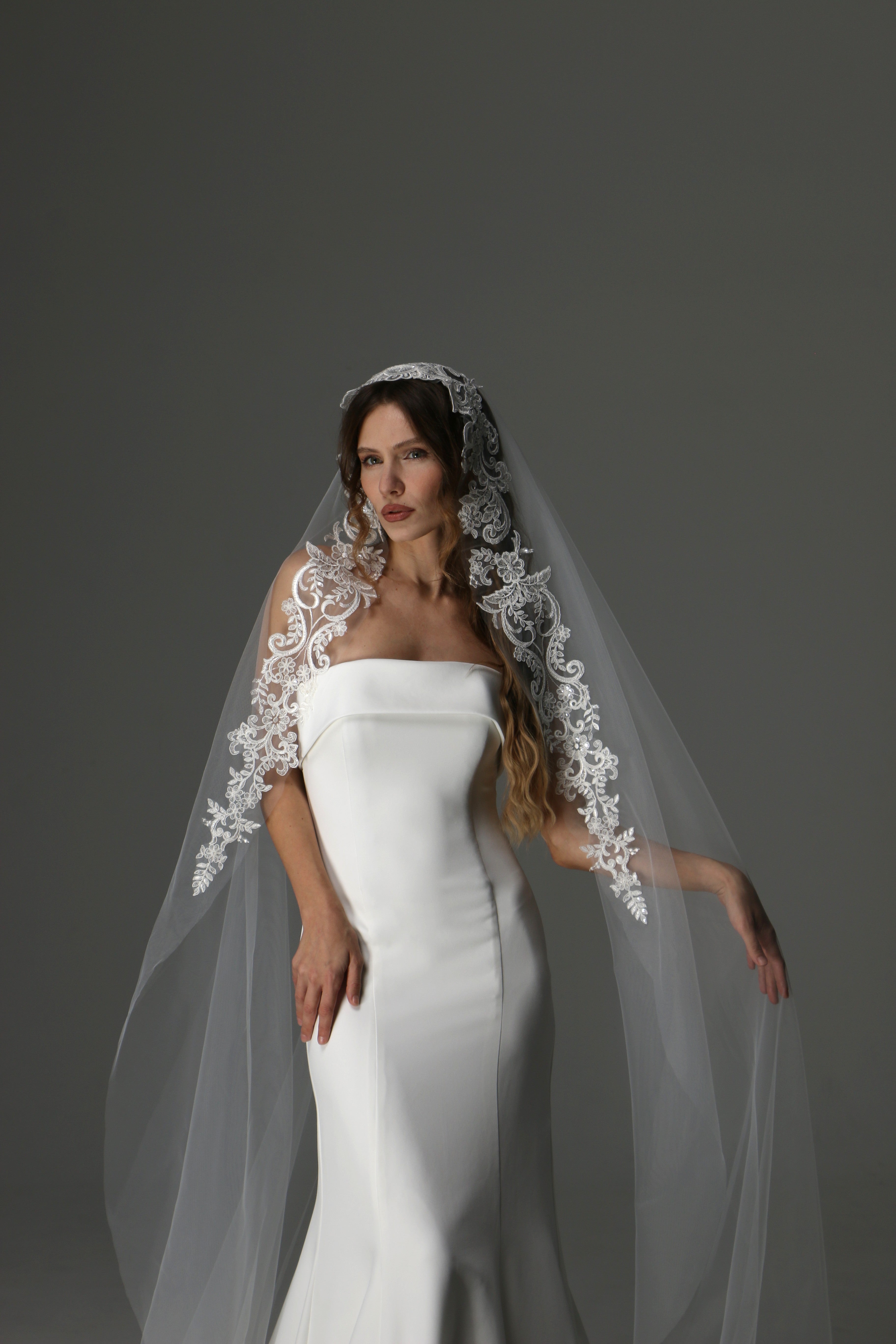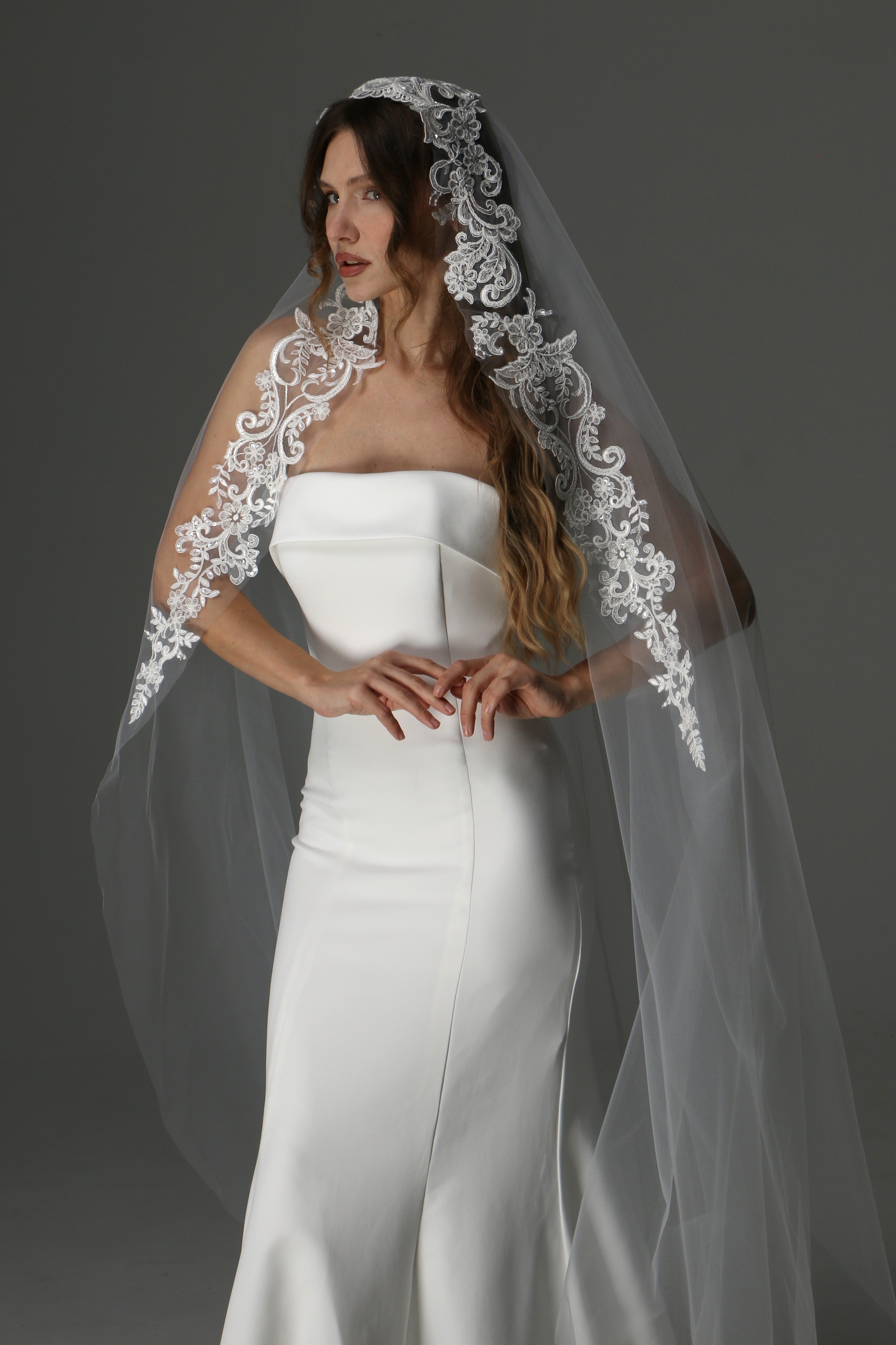 Modern Lace Appliqué Mantilla Veil – One Layer Boho Bridal Veil