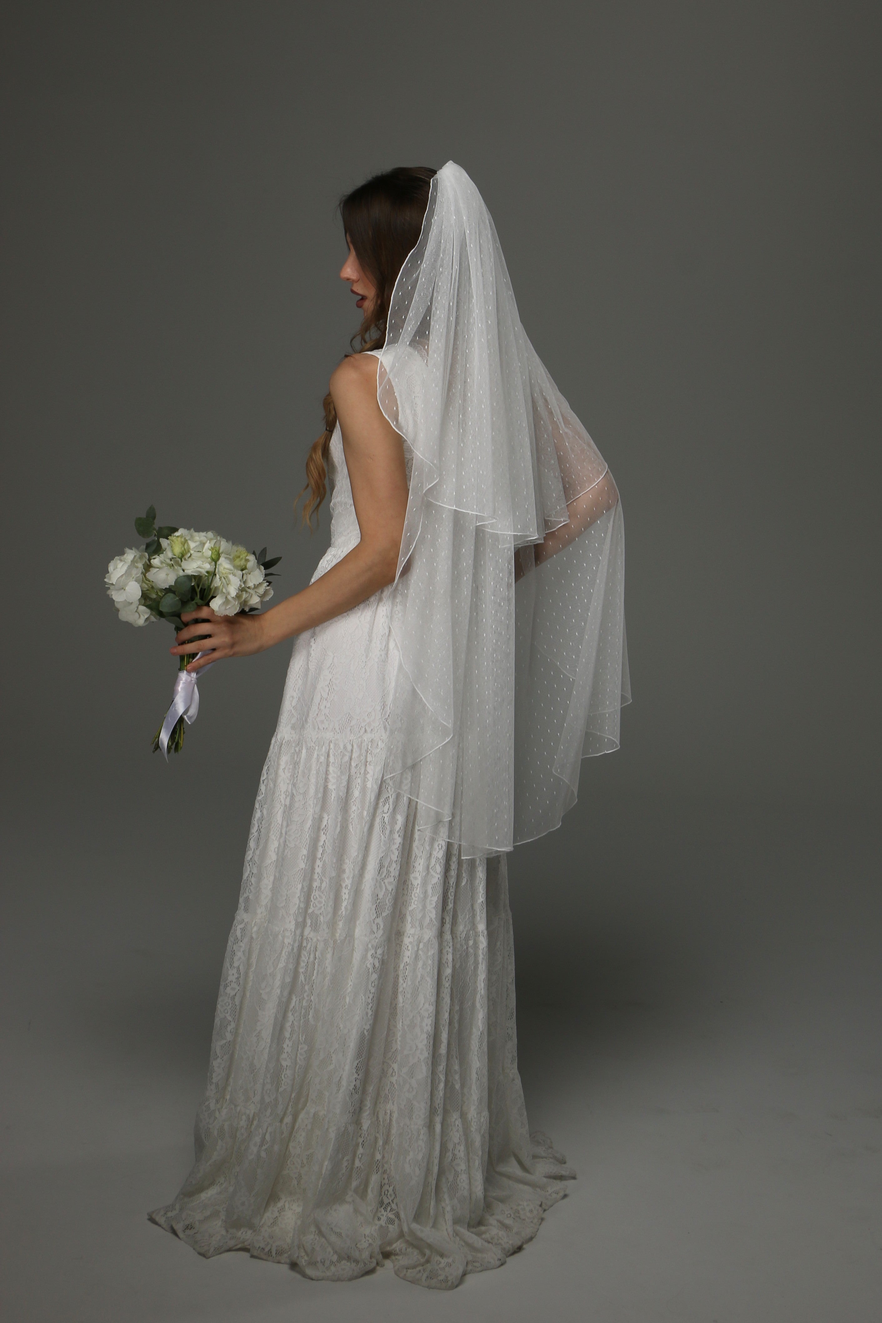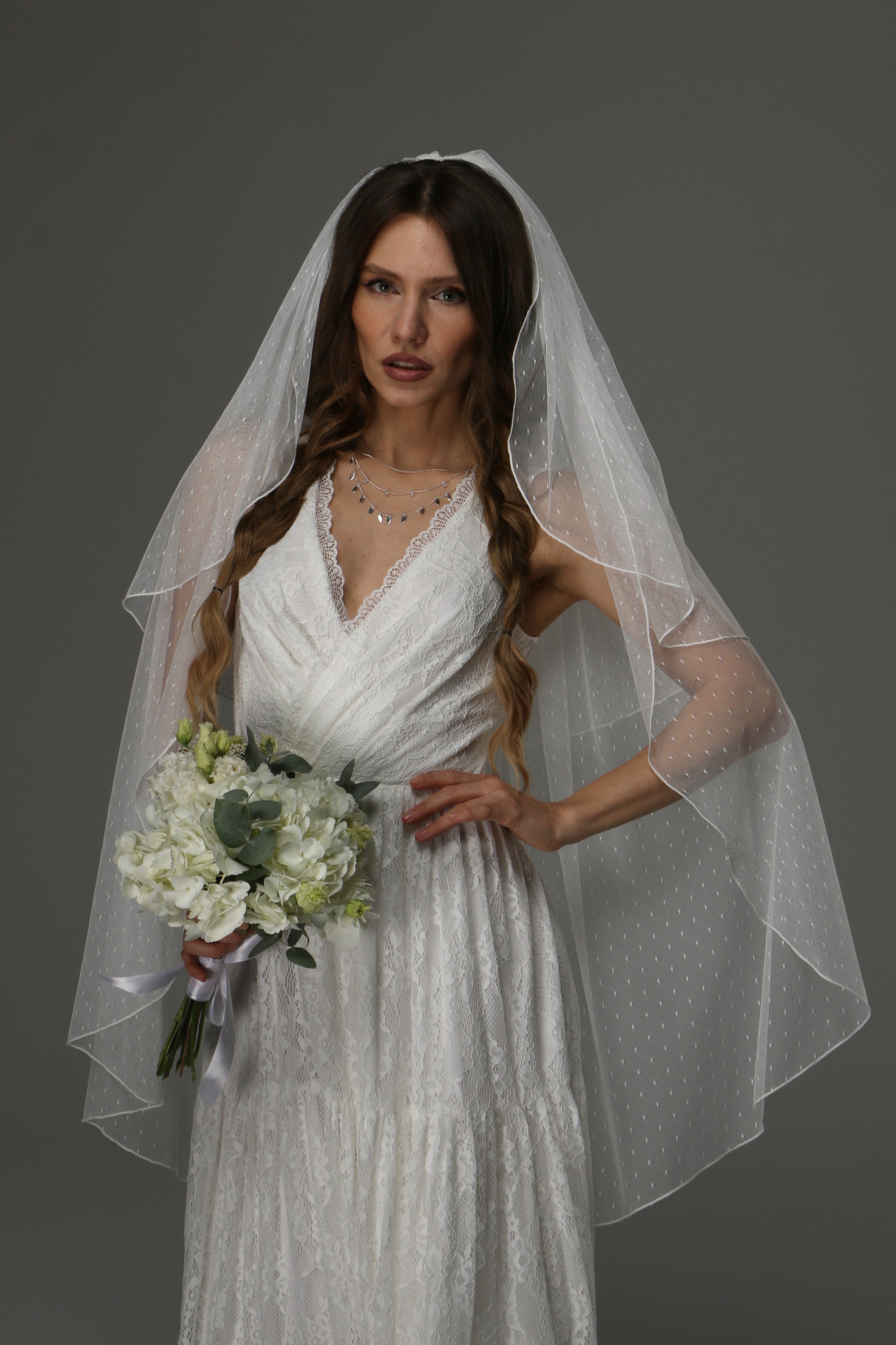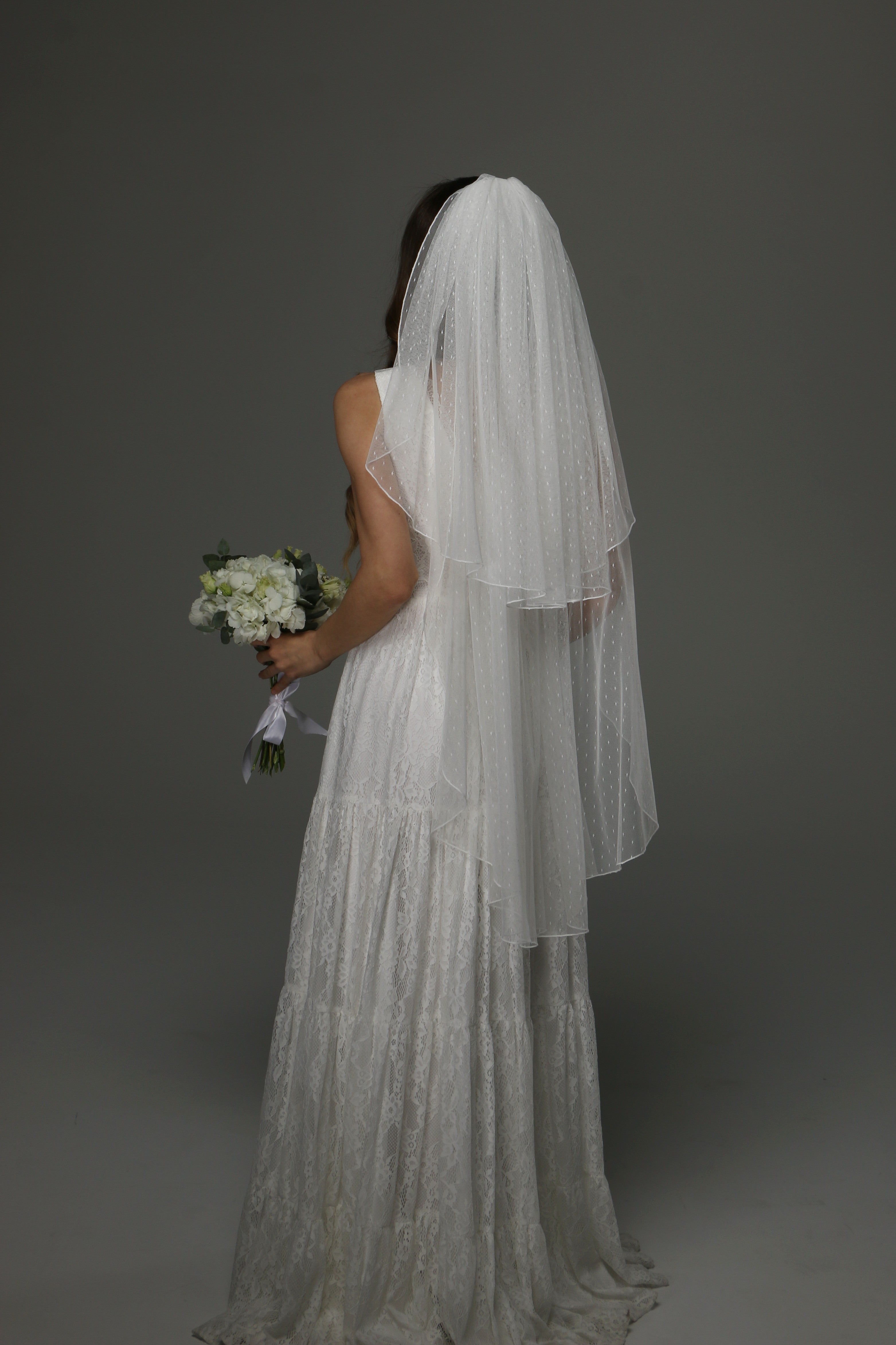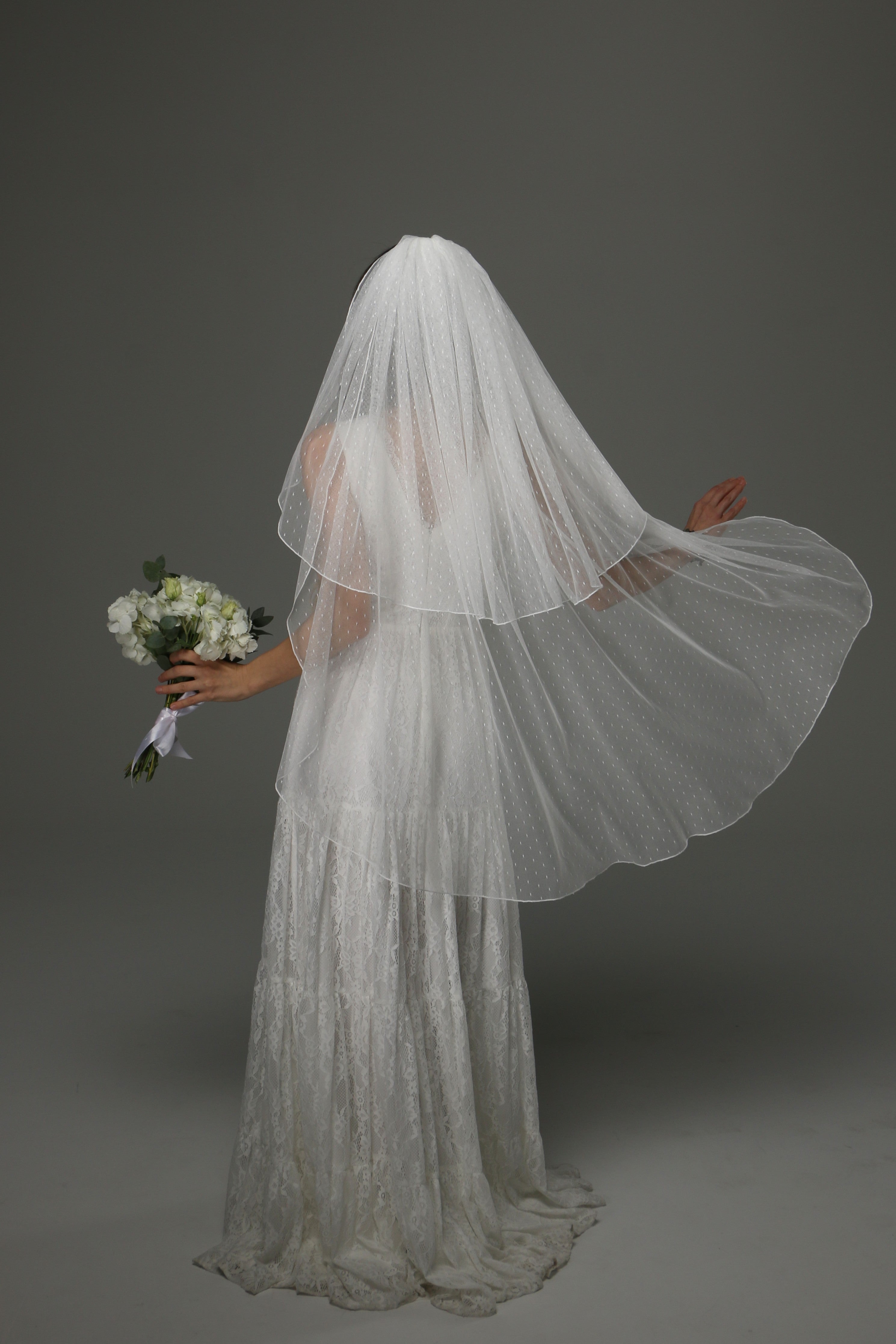 This two-tier wedding veil is a beautiful blend of classic romance and timeless elegance. Crafted from soft dotted tulle, it adds a delicate texture and subtle vintage charm to your bridal look.