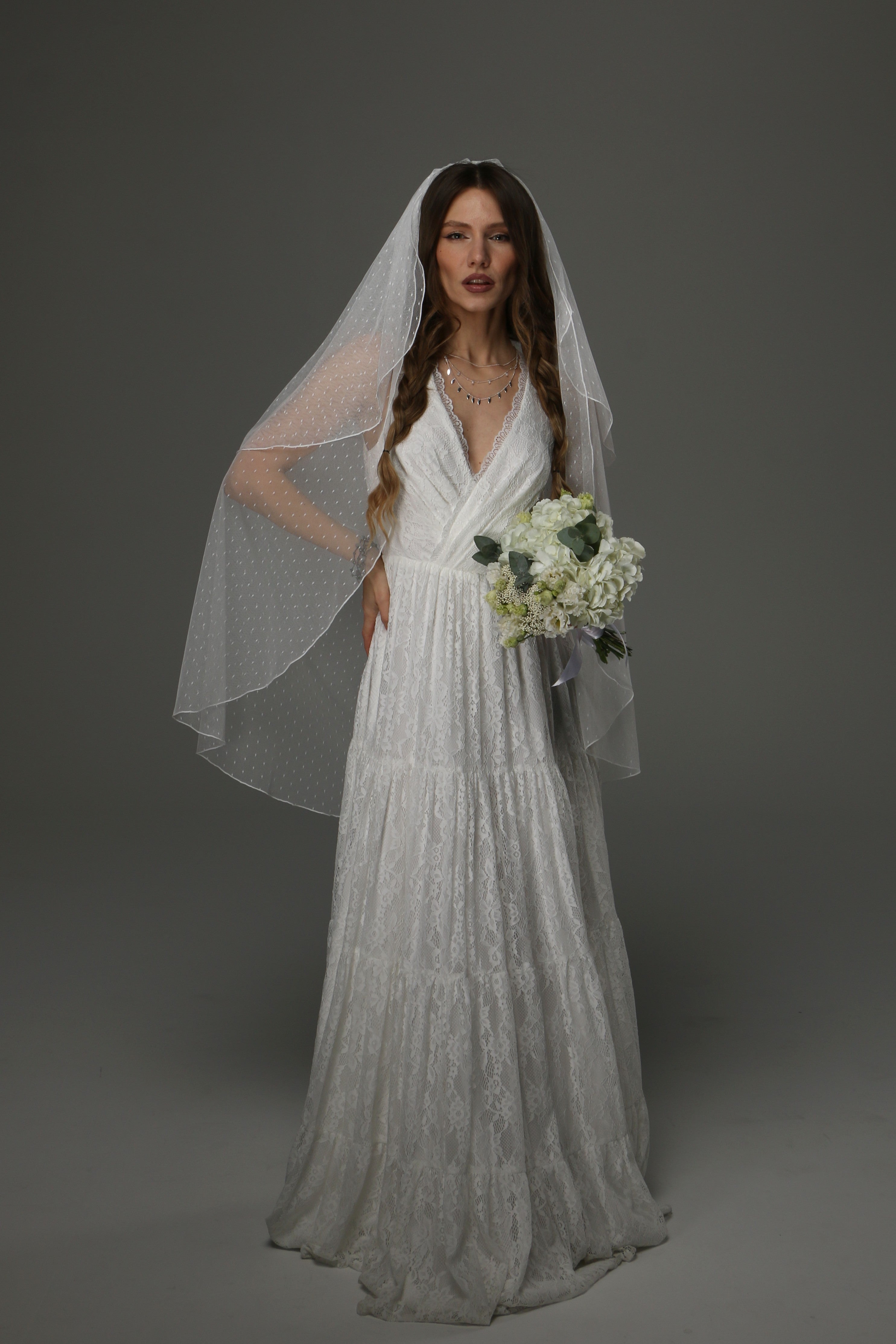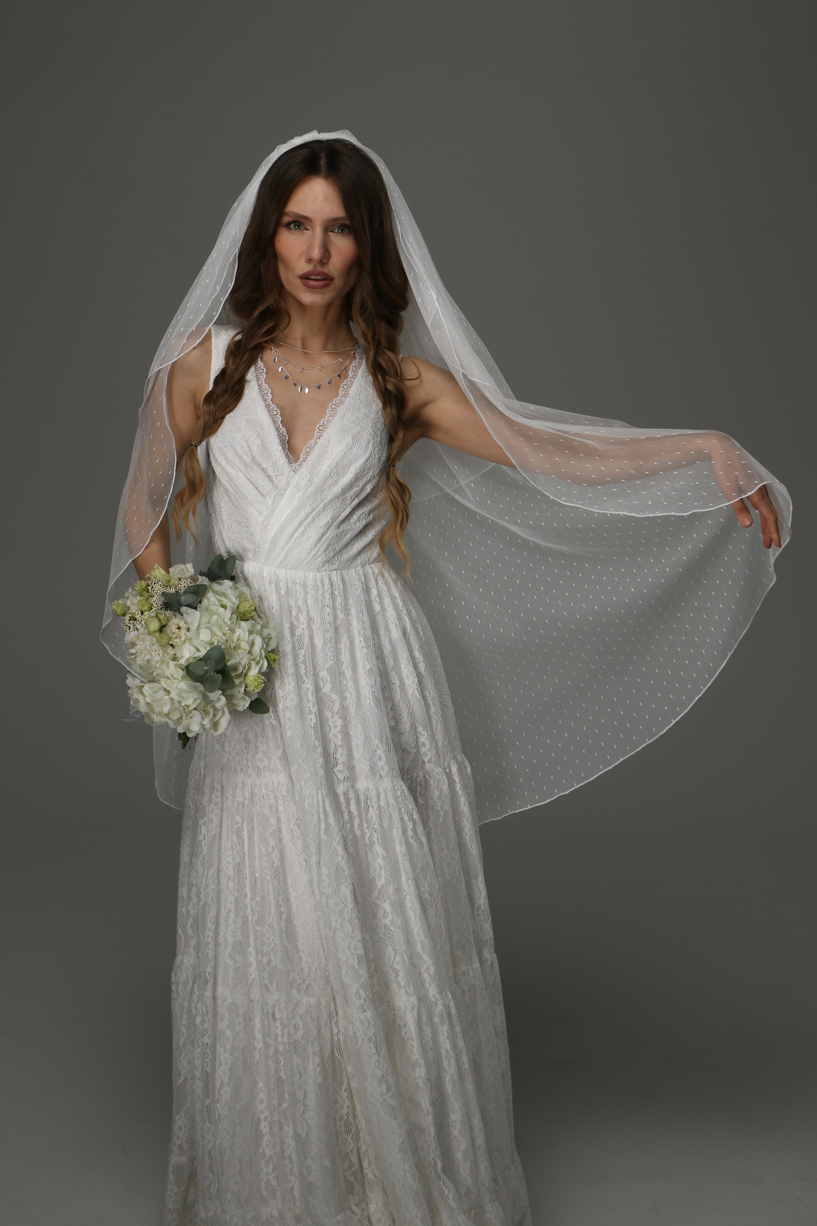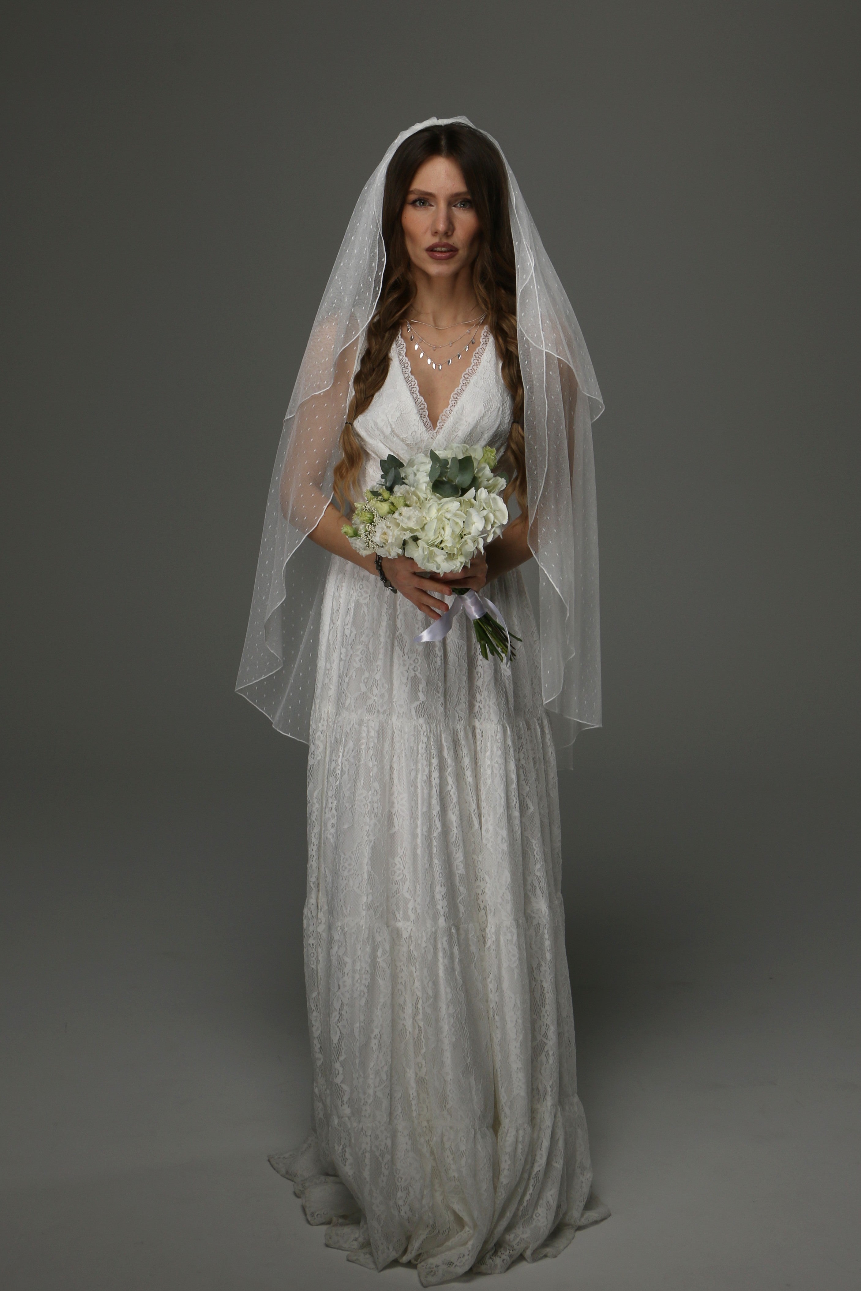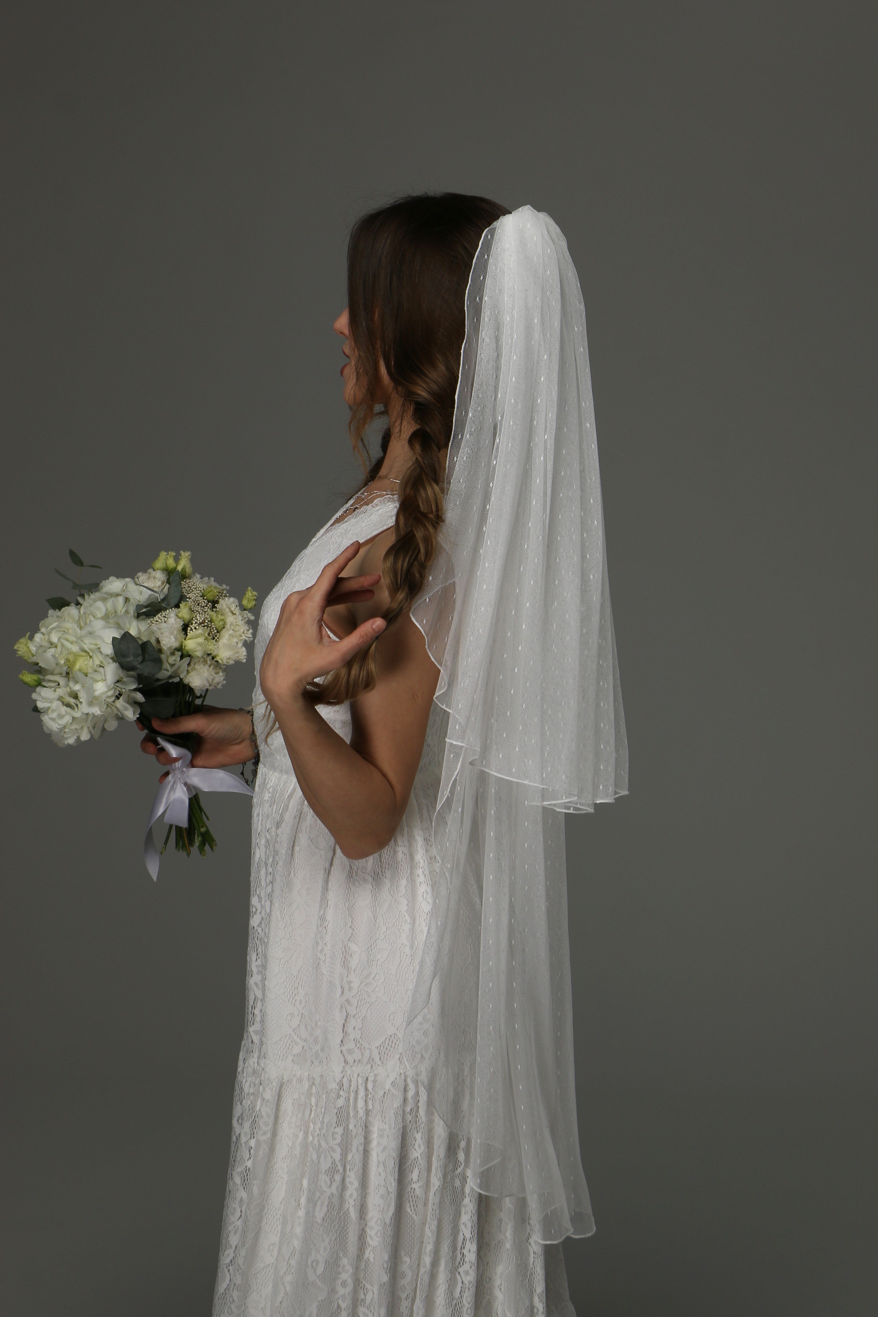 This two-tier wedding veil is a beautiful blend of classic romance and timeless elegance. Crafted from soft dotted tulle, it adds a delicate texture and subtle vintage charm to your bridal look.